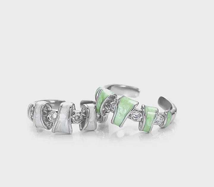 • Design: Open, adjustable ring with a distinctive geometric shape, accented with shimmering zircon stones.