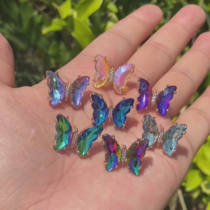 Diese bezaubernden Ohrstecker bestechen durch ihr zartes Schmetterlingsdesign. Die Schmetterlingsflügel sind aus schimmerndem Glas in verschiedenen schillernden Farben gefertigt, die das Licht wunderschön einfangen. Die Fühler sind mit kleinen, funkelnden Edelsteinen verziert, die für zusätzliche Eleganz sorgen.