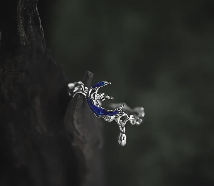 Add a touch of celestial charm to your look with this unique crescent moon ring. The ring features a creatively designed band with a prominent blue-enameled crescent moon accent.