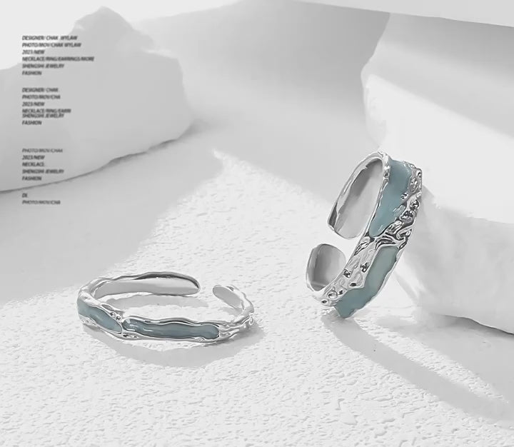 These stylish rings feature a unique open design, offering adjustability for a comfortable fit. The bands are adorned with a textured, almost sculptural element, highlighted with a light blue glue drop detail that adds a touch of color and sophistication.