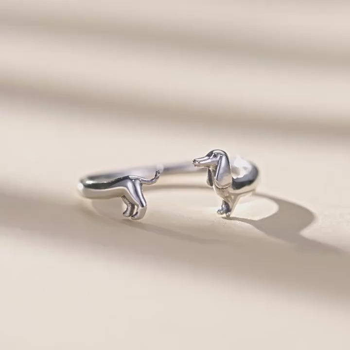 This adorable ring features a delightful dachshund design. The ring wraps around the finger, with the dog's head and tail forming the open ends. This unique design adds a playful and stylish touch to any outfit.