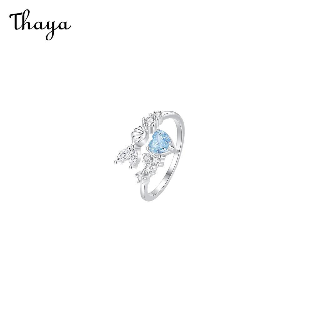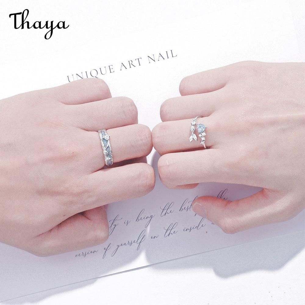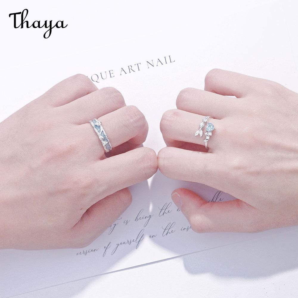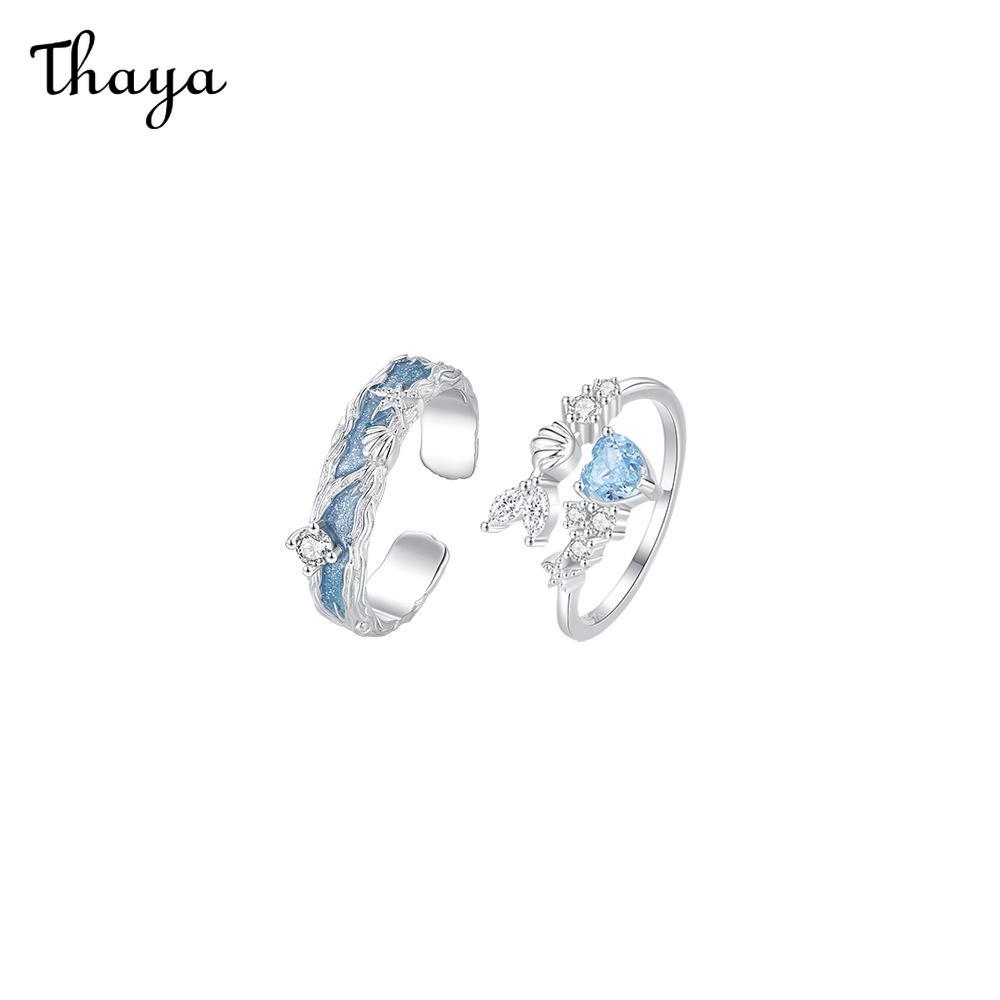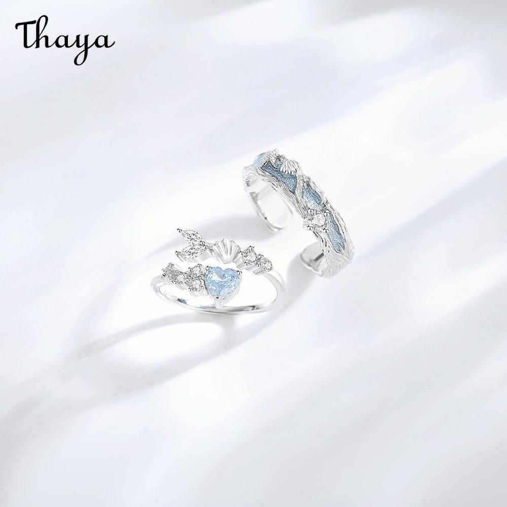 - Design: One ring showcases a textured band with blue enamel and ocean detailing, while the other features a heart-shaped blue gemstone surrounded by shimmering accents.