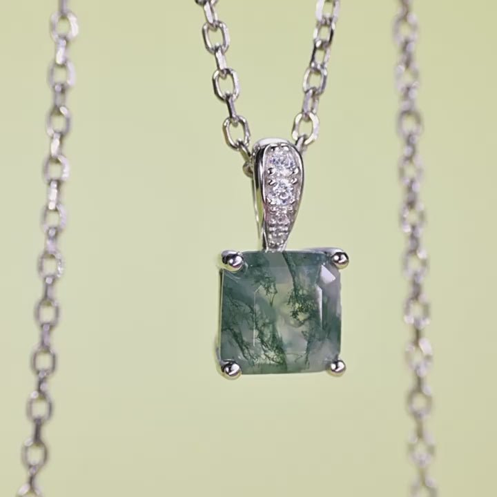 This elegant necklace features a beautiful square pendant. The focal point is a large, cushion-cut green moss stone with unique natural patterns. The pendant is connected to the chain with a decorative silver toned element adorned with small stones.