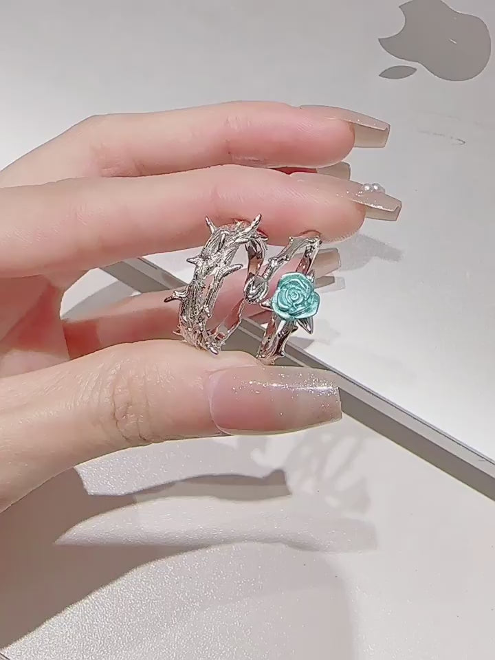 - Design: Thorny branch intertwined ring with a blue rose accent