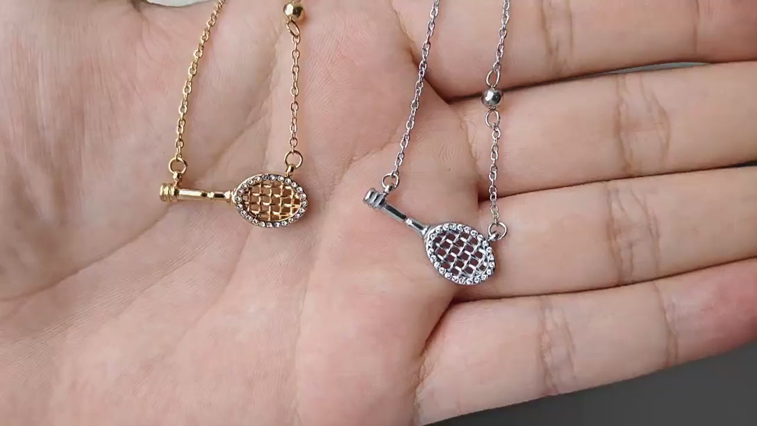 Showcase your love for tennis with this unique and stylish necklace! This delicate piece features a miniature tennis racket pendant. The racket face is adorned with sparkling accents, adding a touch of glamour to your sporty look.