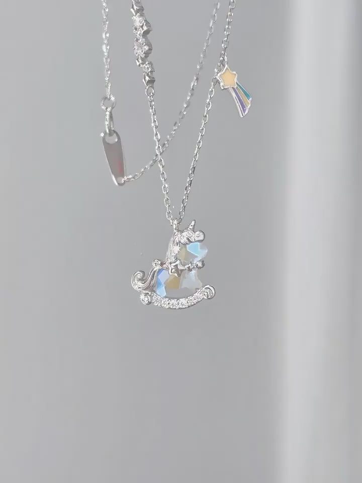 This charming necklace features a whimsical rocking horse pendant, evoking a sense of childlike wonder and delight. The pendant is adorned with glittering accents that catch the light with every movement. A star charm adds a touch of magic to the design.