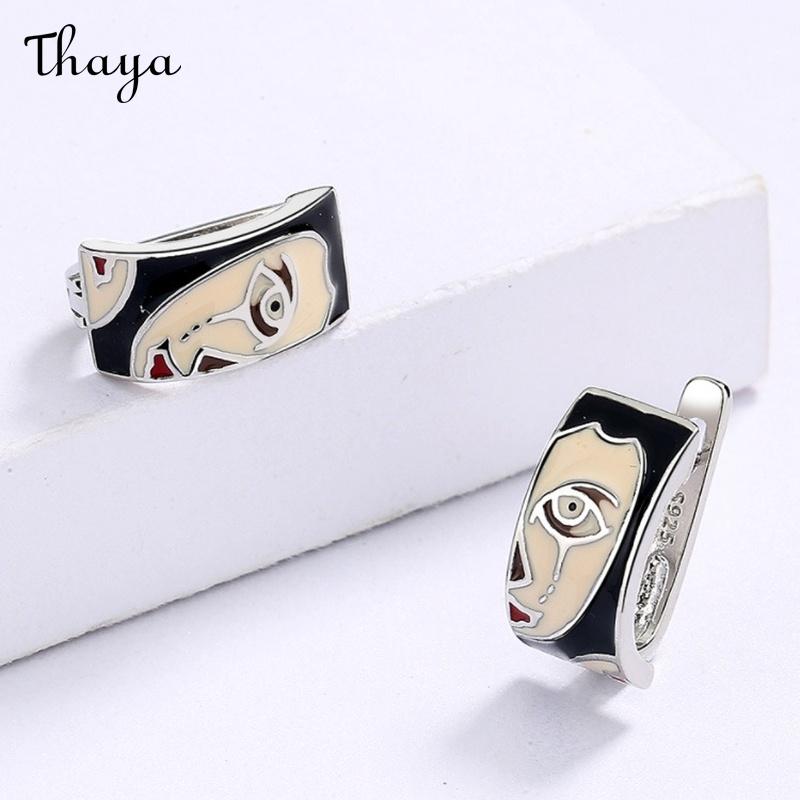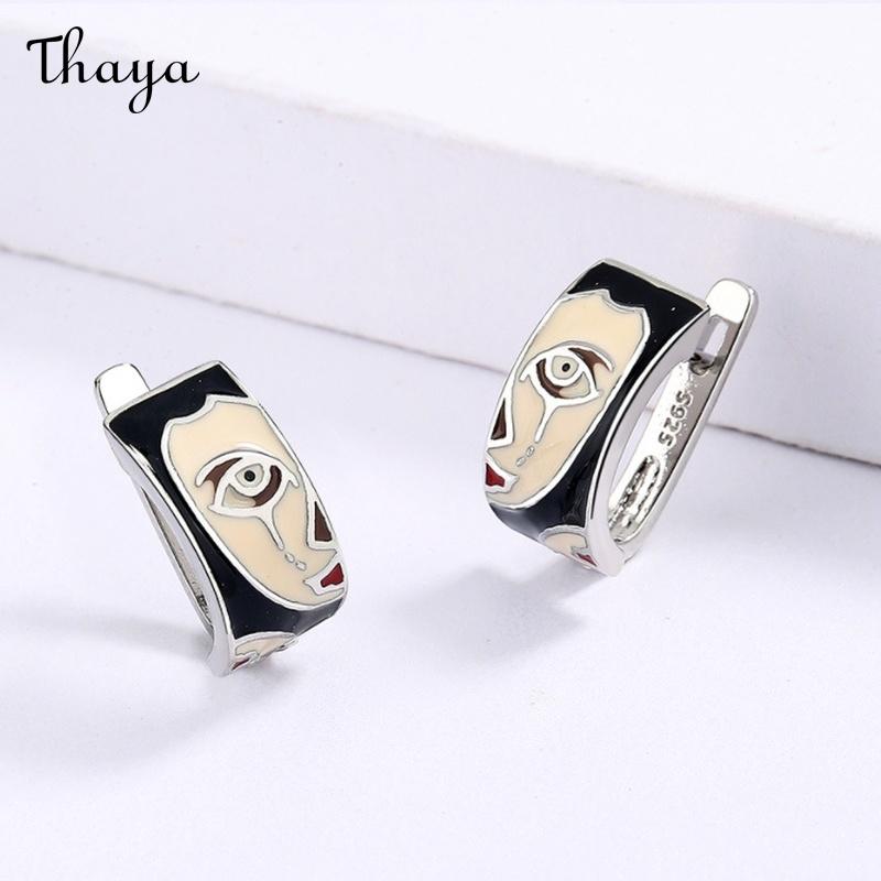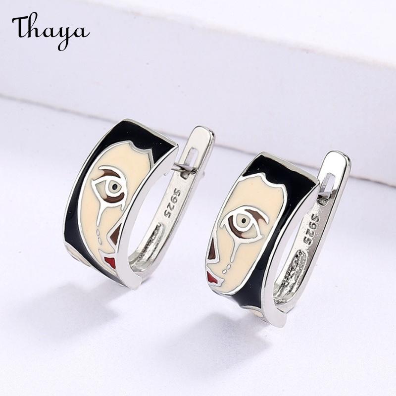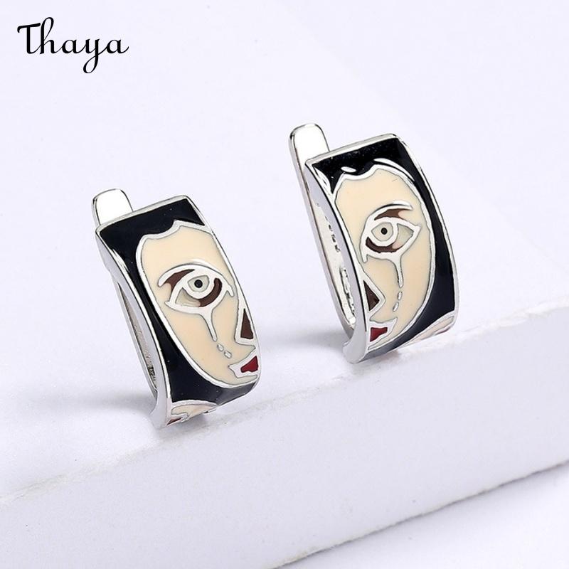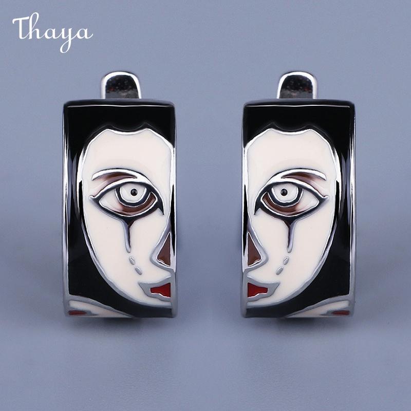 These uniquely designed earrings feature an abstract depiction of a face. The design incorporates bold lines and contrasting colors for a striking visual effect. These earrings are sure to add an artistic touch to your style.
