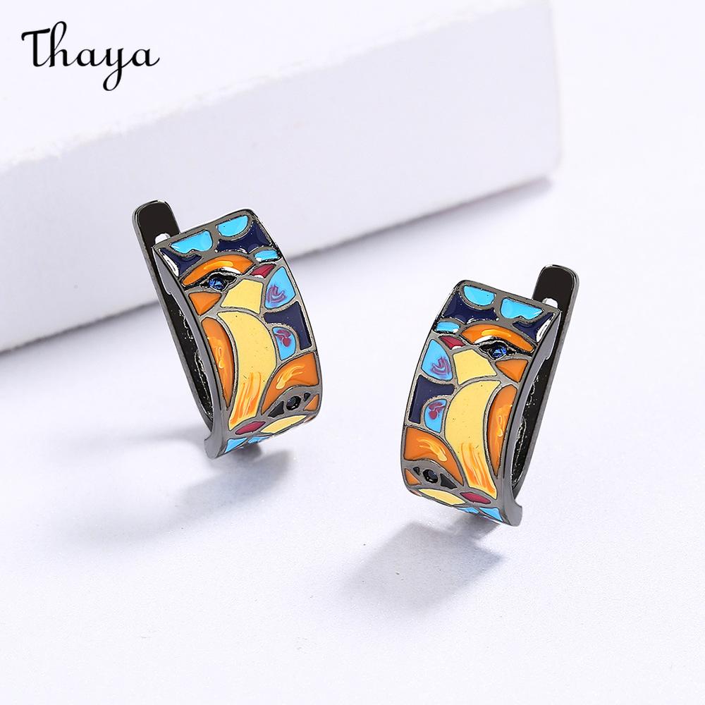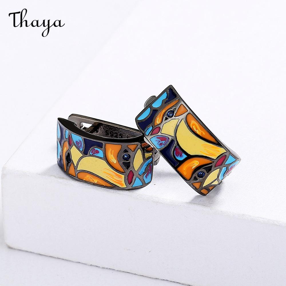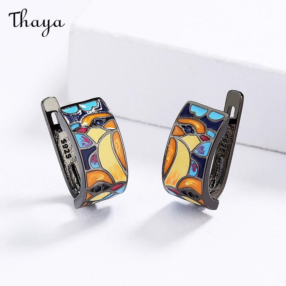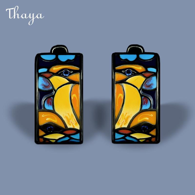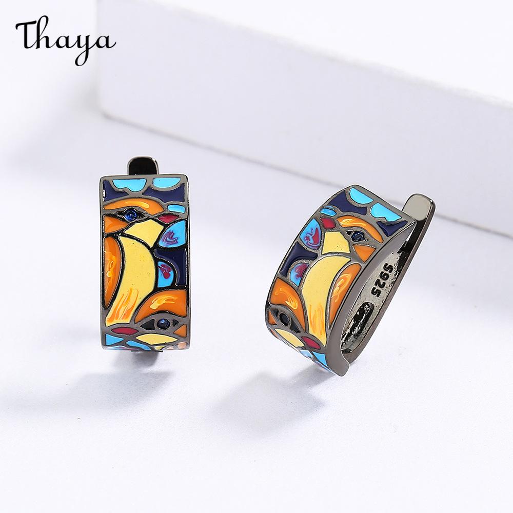 These unique earrings showcase an Art Deco style design, featuring a stylized bird motif within a rectangular frame. The vibrant colors and intricate details create a captivating visual effect. The birds have tiny blue gemstones as eyes.