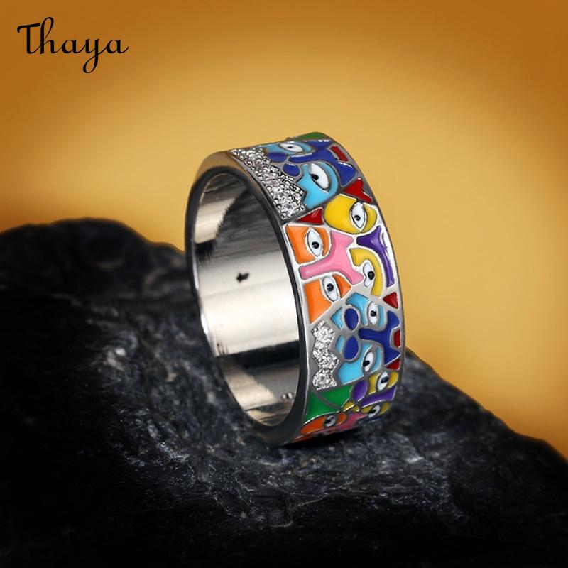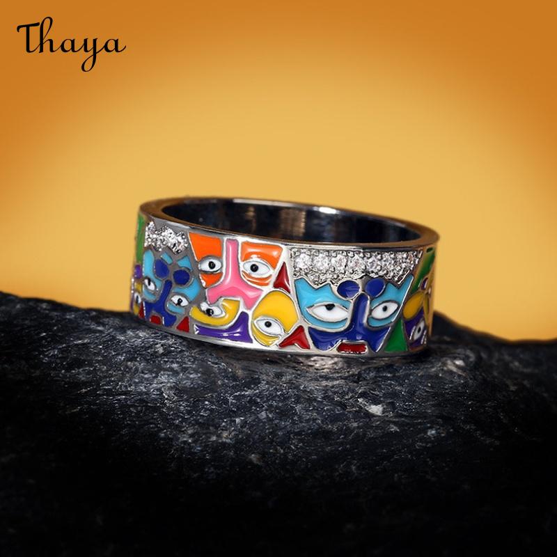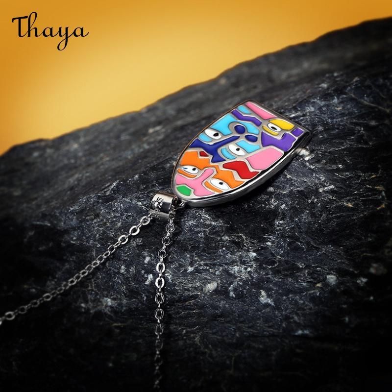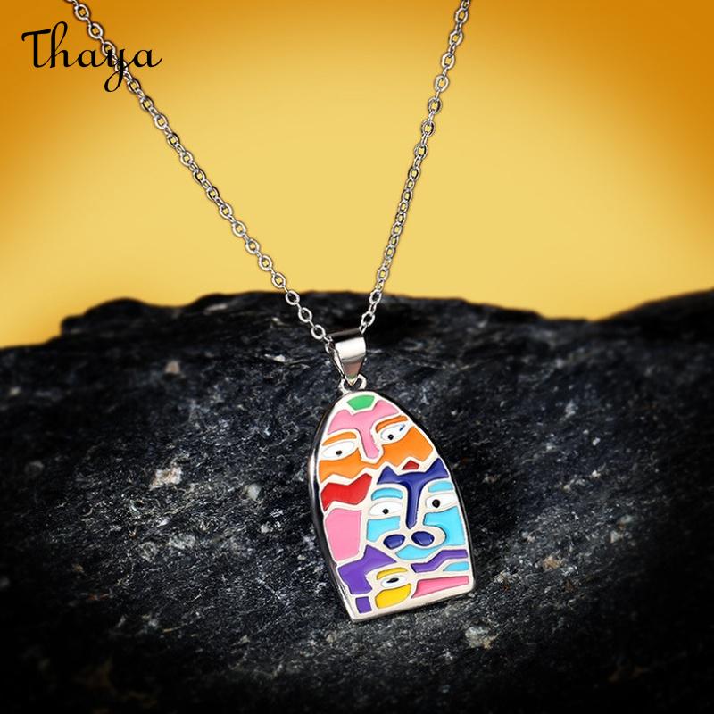 This set features a unique necklace with a pendant and a matching ring, both adorned with colorful abstract face designs. These pieces are perfect for adding a playful and artistic touch to any outfit.