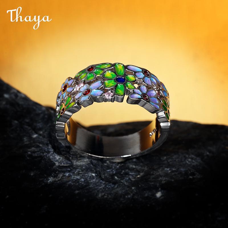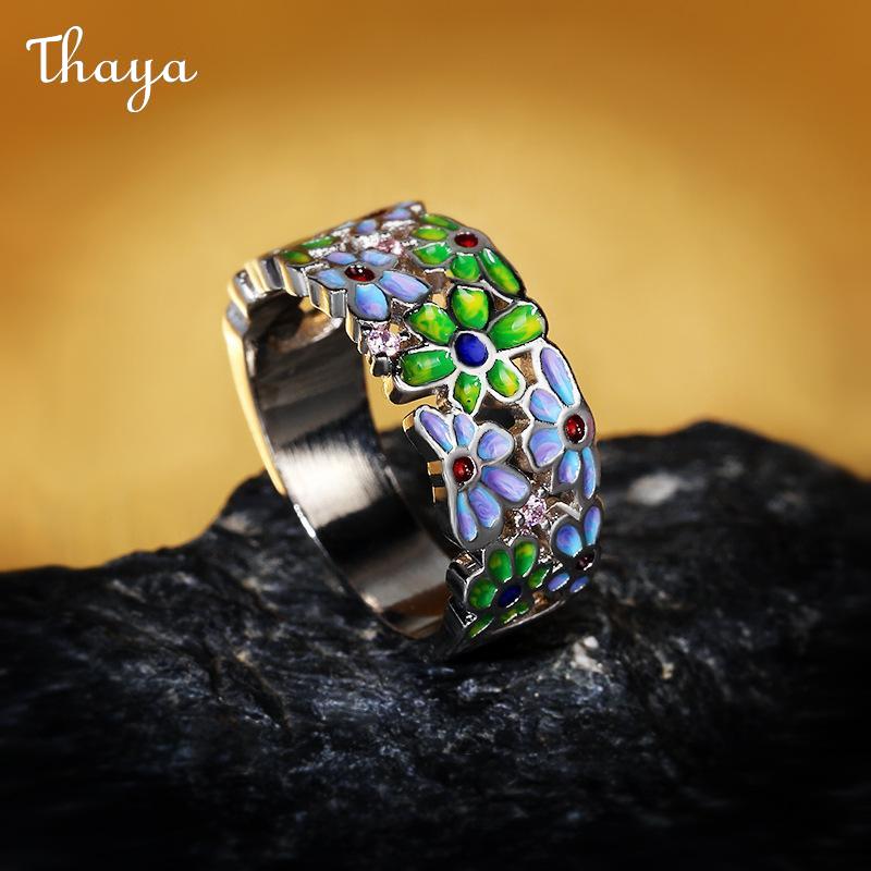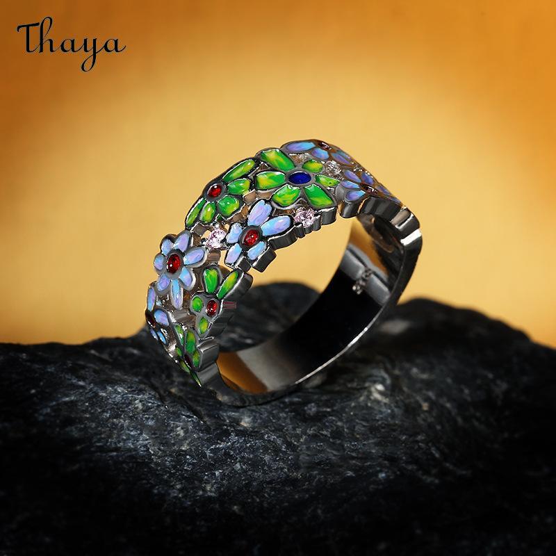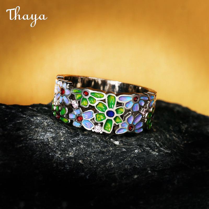 This charming ring showcases a delightful floral design, perfect for adding a touch of whimsy to your style. The ring features colorful enamel flowers and small accent stones.