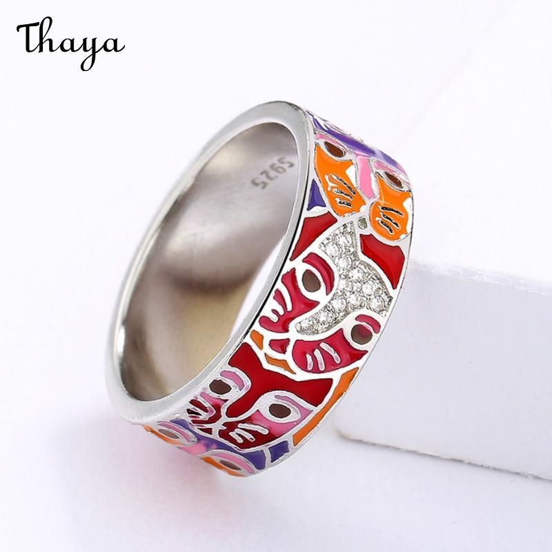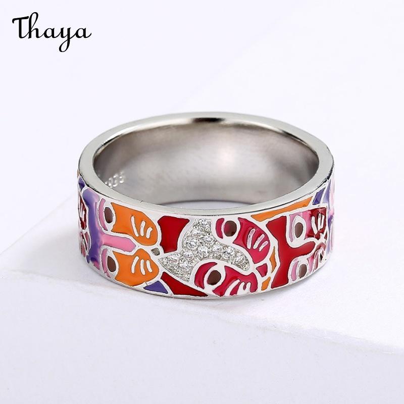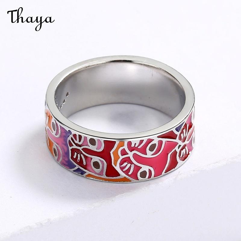 This vibrant ring features a playful design of stylized cat faces rendered in colorful enamel. The enamel artwork is accented by a scattering of sparkling stones that add a touch of glamour.