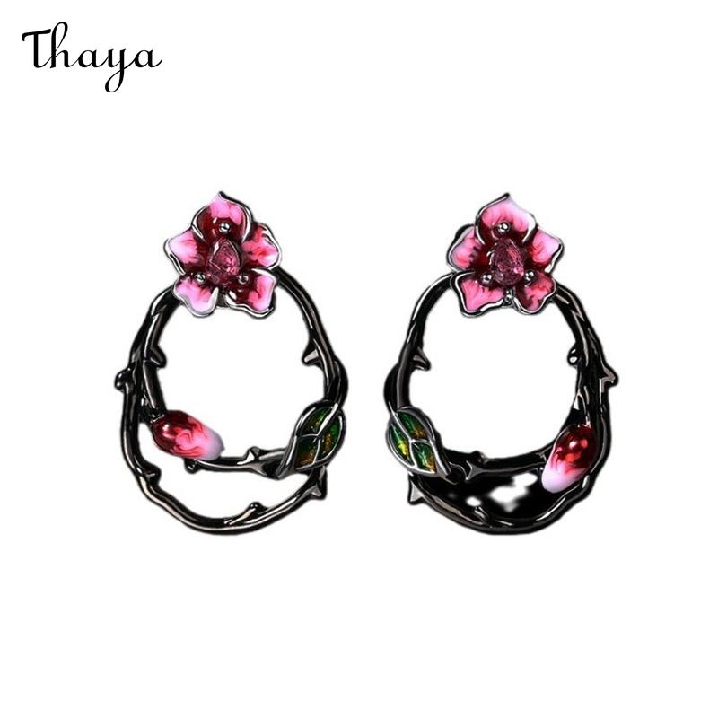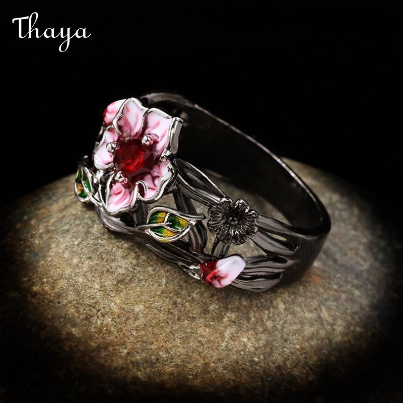 Thaya Enamel Black Gold-Plated Two-Color Dark Rose Ring Necklace Earrings Jewelry Set