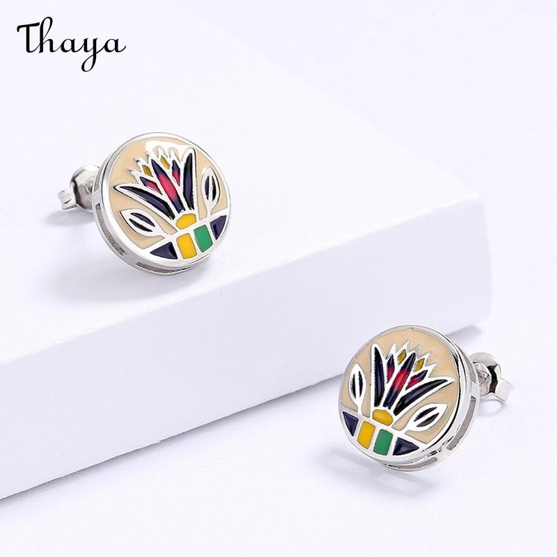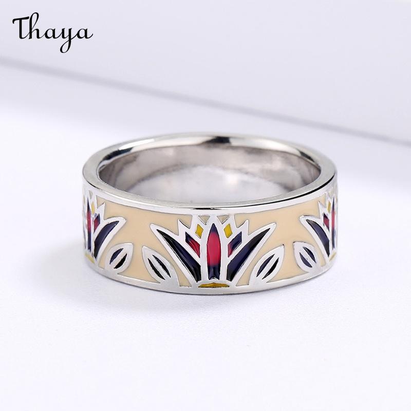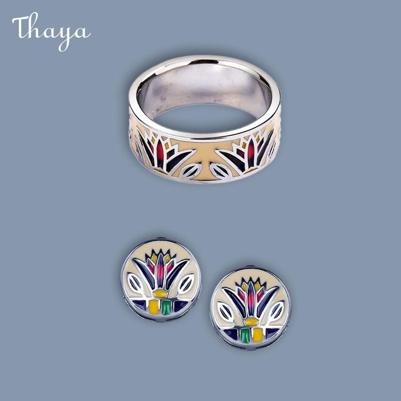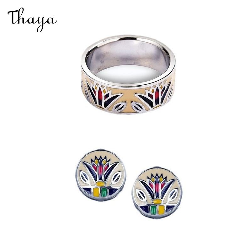 This jewelry set includes a matching ring and stud earrings. The design features stylized lotus flowers, accented with colorful enamel details.