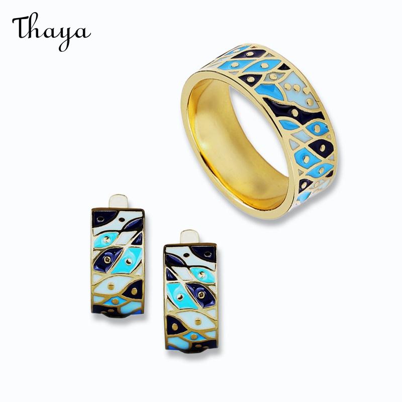 This jewelry set features a beautiful ring and matching earrings, adorned with a unique enamel design. The repeating pattern uses shades of blue, white, and black to create an eye-catching look.