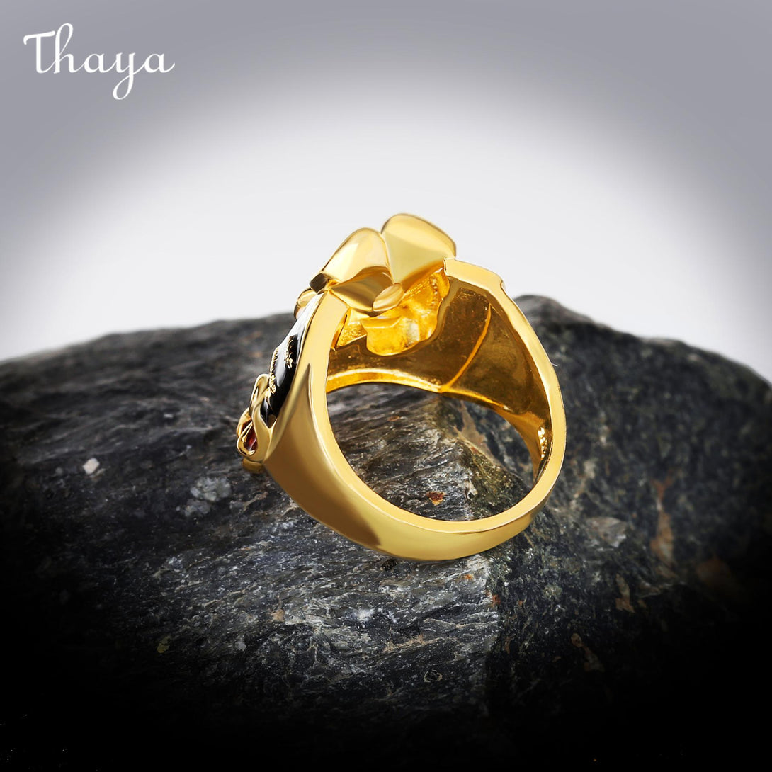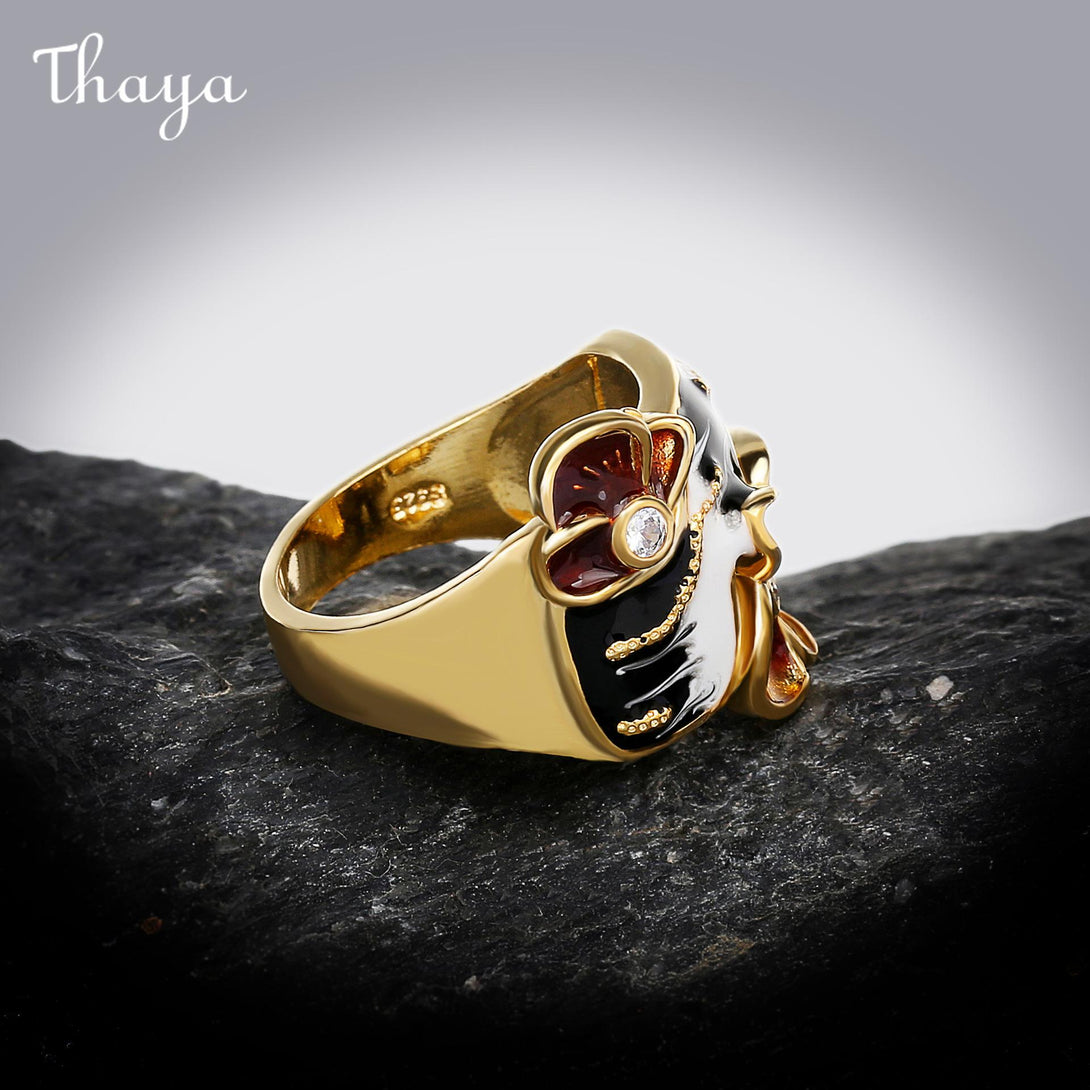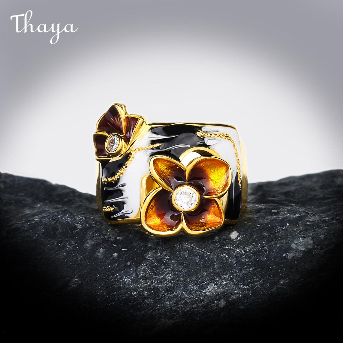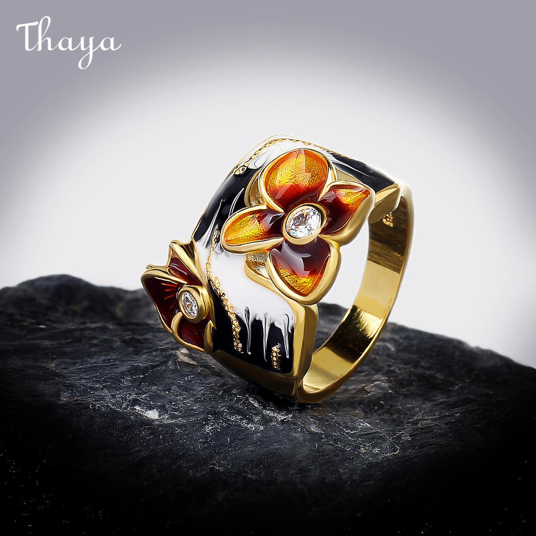 This eye-catching ring features a unique floral design. The ring's surface is adorned with enamel in contrasting black and white, adding a modern artistic touch. The band is crafted from polished brass, offering a comfortable and stylish fit.