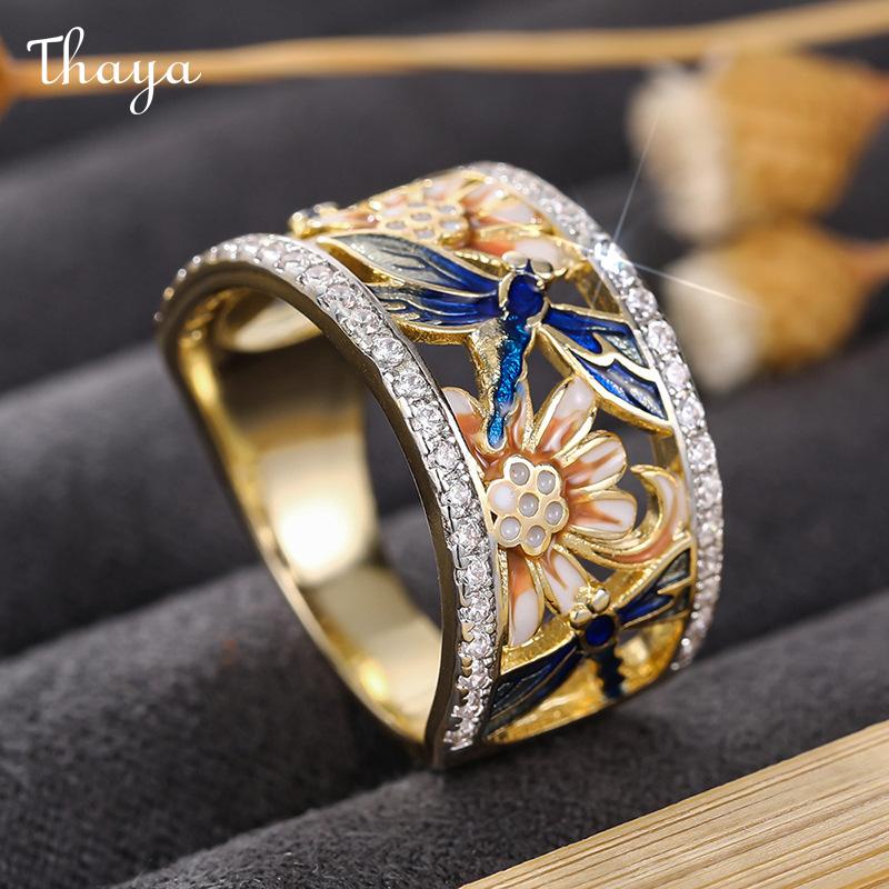 This beautiful ring features an intricate floral and dragonfly design. The openwork style allows for light to pass through, enhancing the sparkle of the zircon accents along the edges.