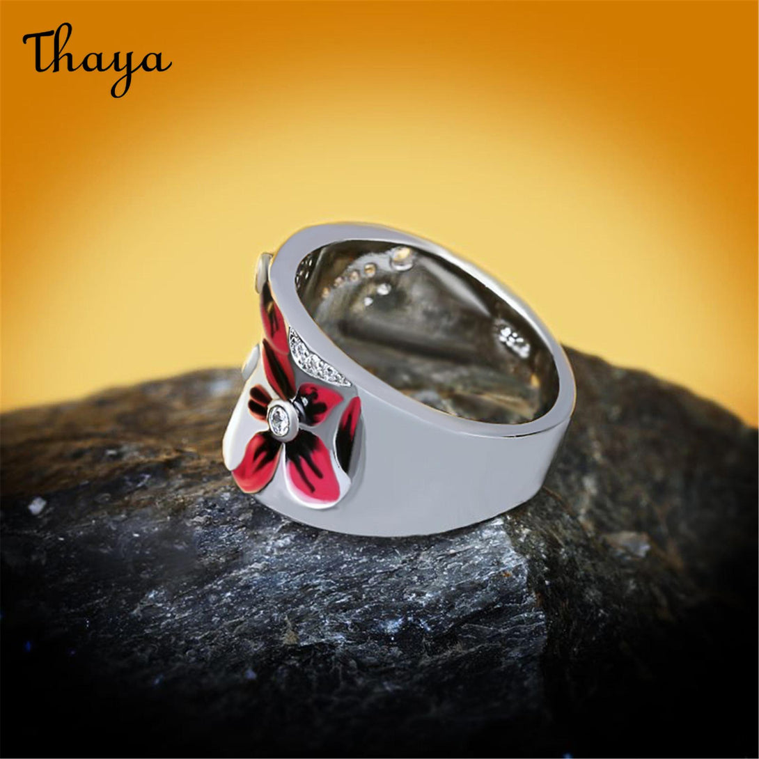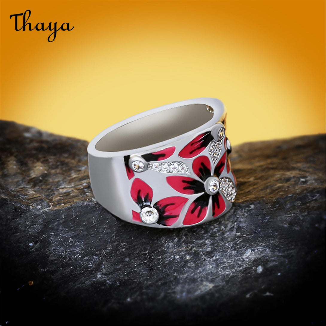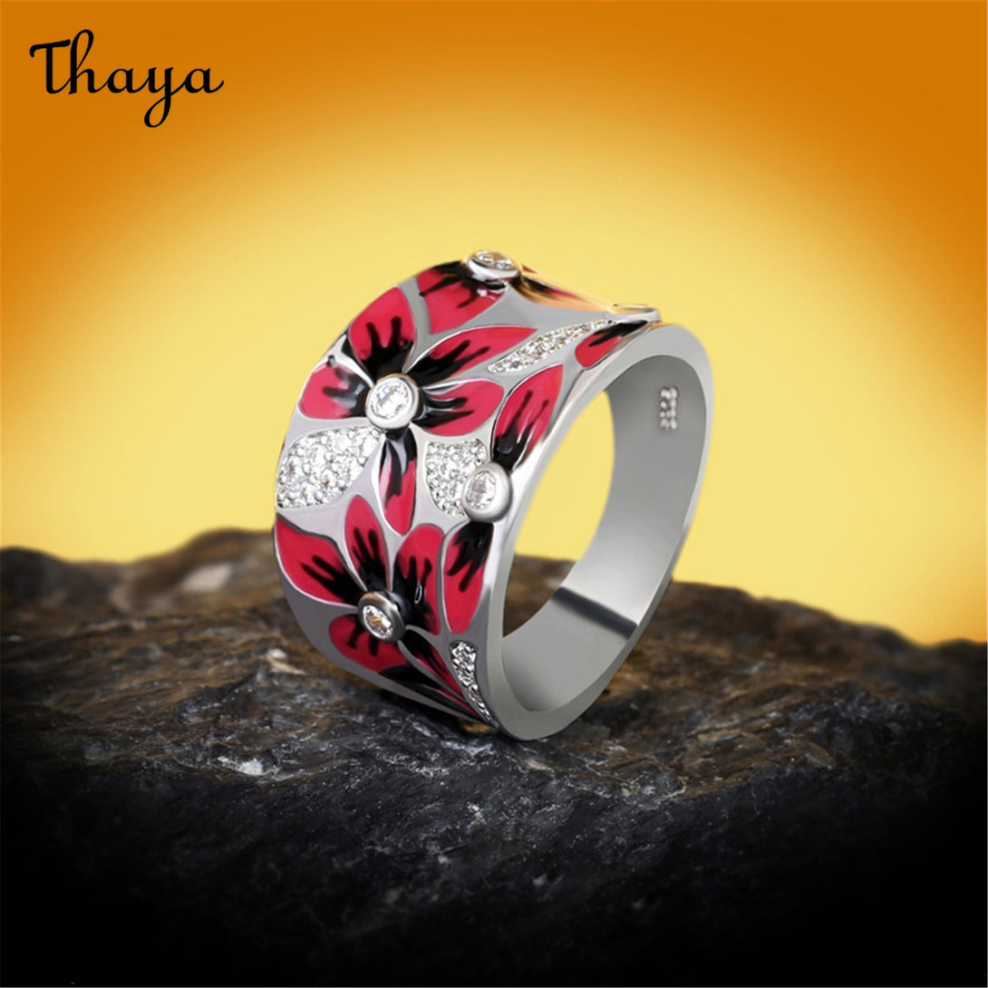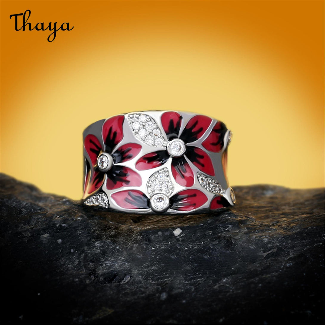This eye-catching ring features a vibrant floral design. The ring showcases an array of flowers with pink petals and black accents, complemented by sparkling gemstones. The colorful enamel adds a unique touch to this piece, making it a standout accessory.