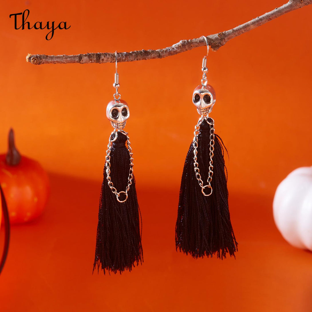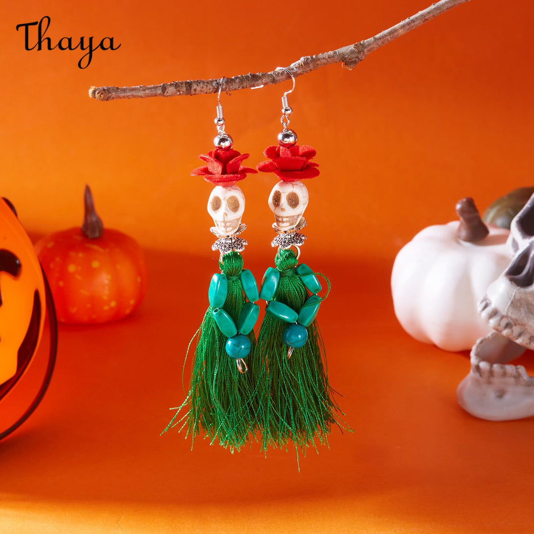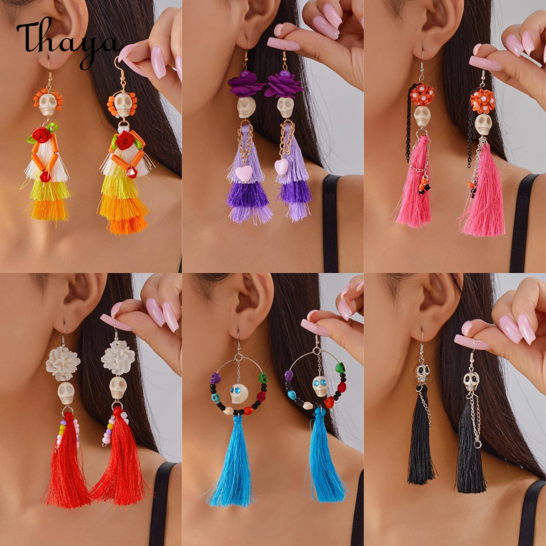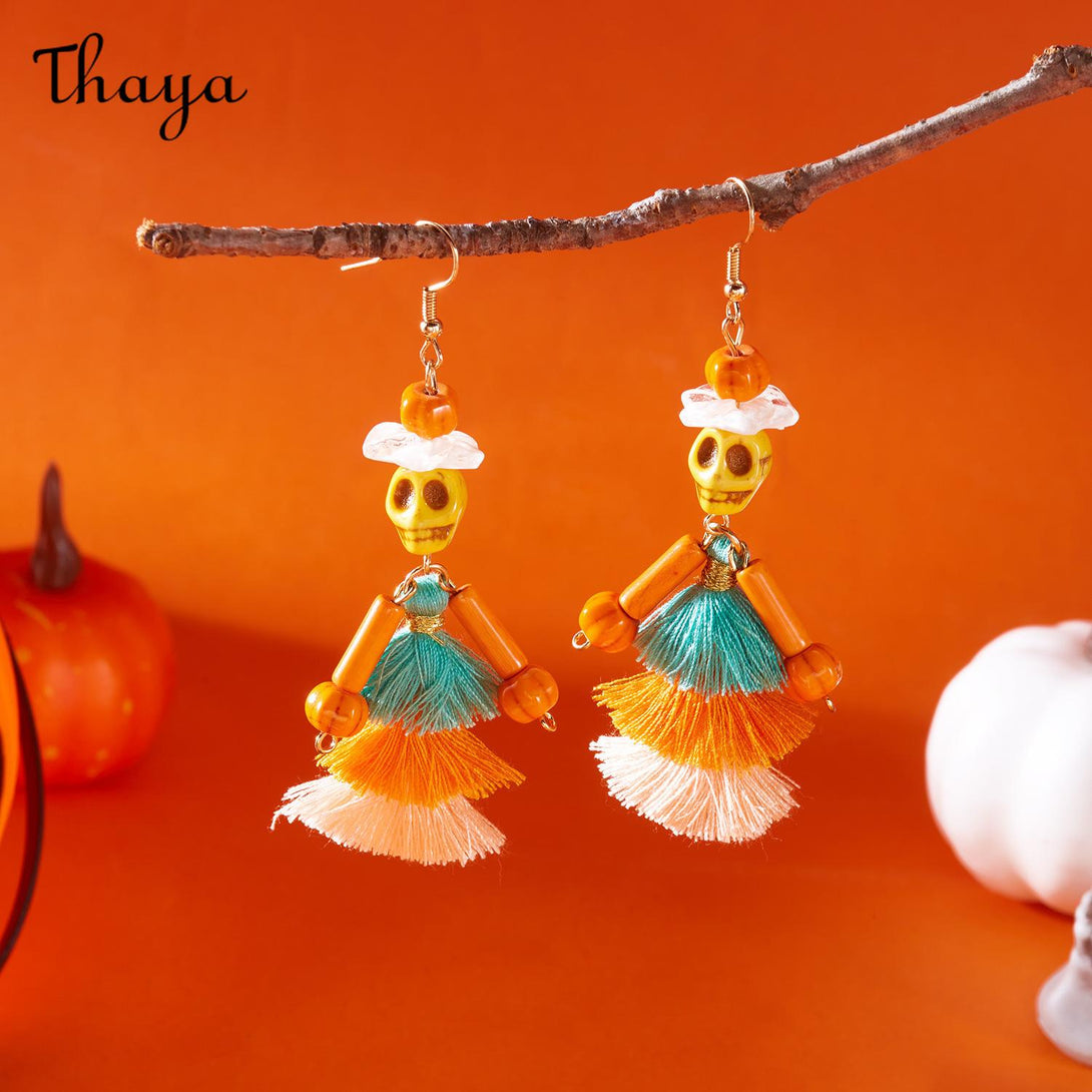 Express your unique style with these Halloween-themed dangle earrings. Featuring playful skull motifs and vibrant tassel designs, these earrings add a touch of edgy charm to any outfit.