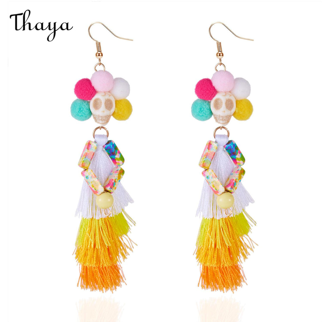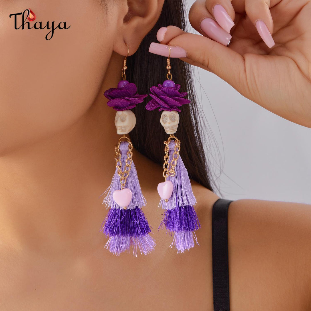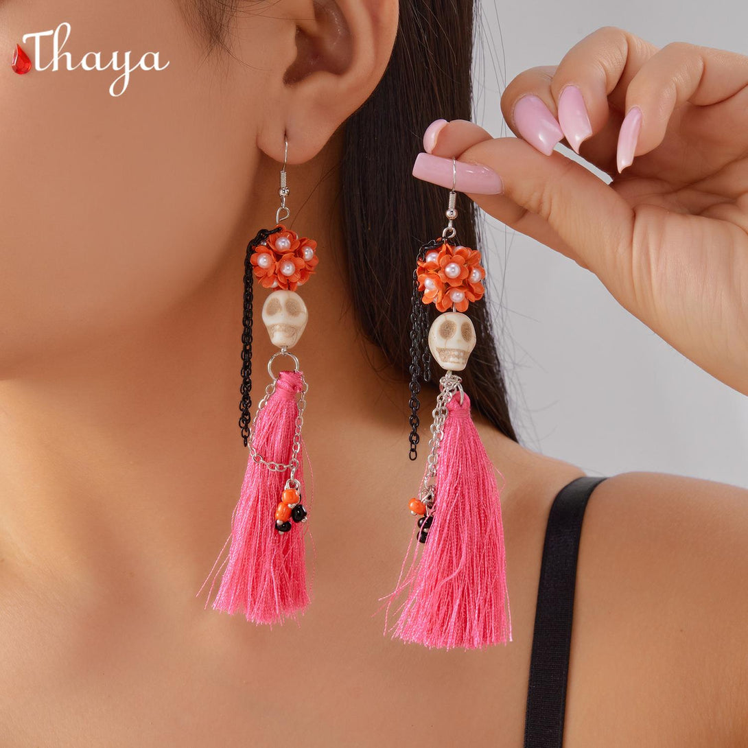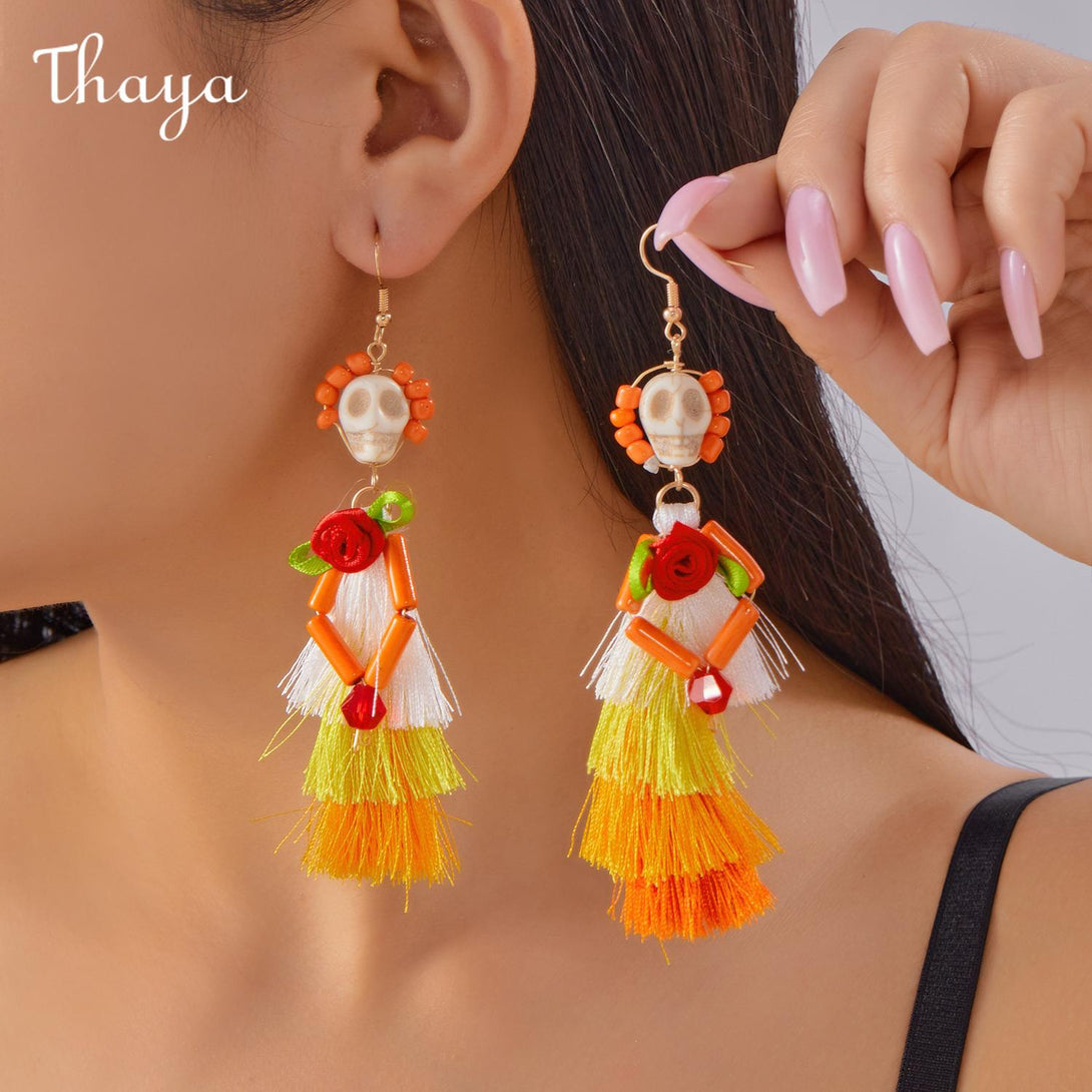 Express your unique style with these Halloween-themed dangle earrings. Featuring playful skull motifs and vibrant tassel designs, these earrings add a touch of edgy charm to any outfit.