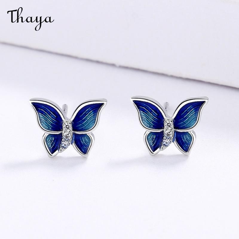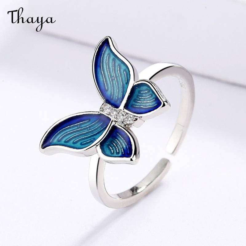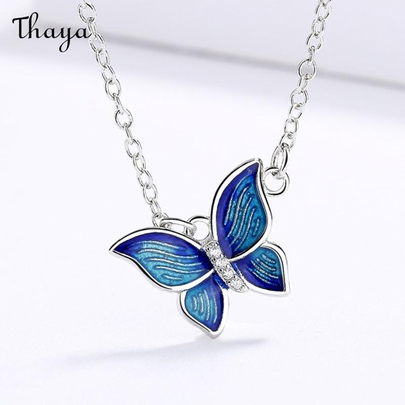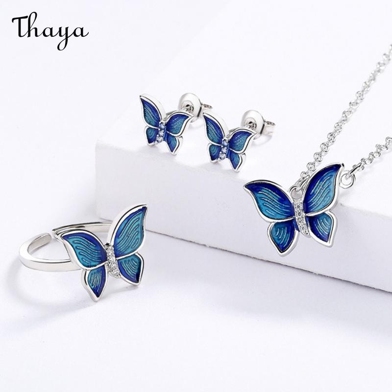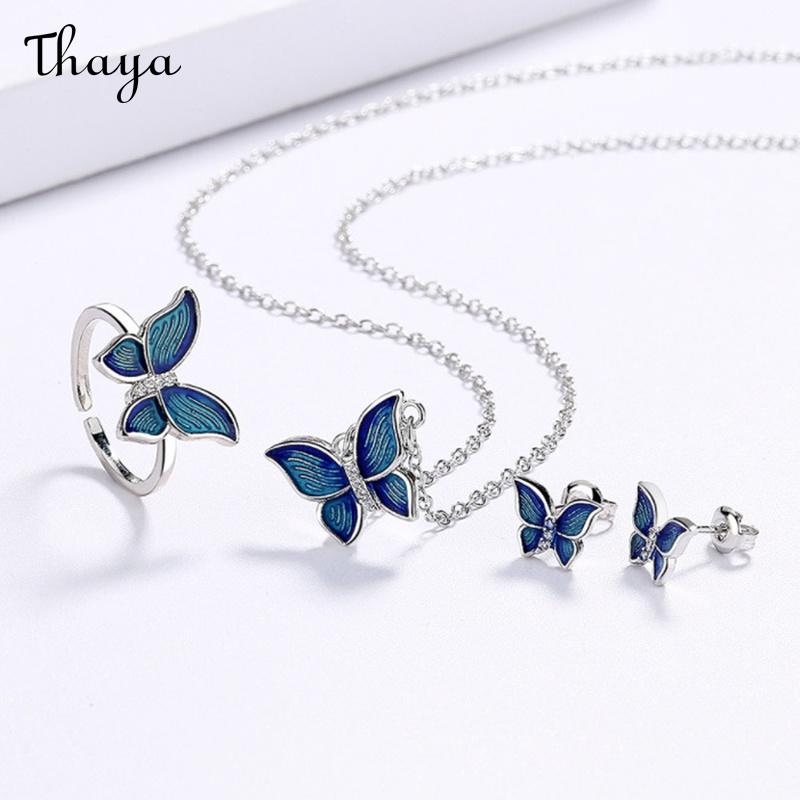 This charming jewelry set features delicate butterfly designs. It includes a necklace, a pair of earrings, and a ring, all adorned with vibrant blue enamel wings. The butterfly wings showcases beautiful color gradients and are accented with sparkling stones. This coordinated set brings a touch of whimsical elegance to any outfit.