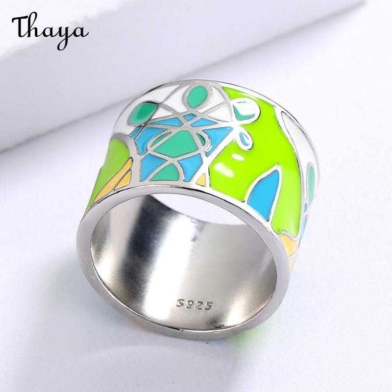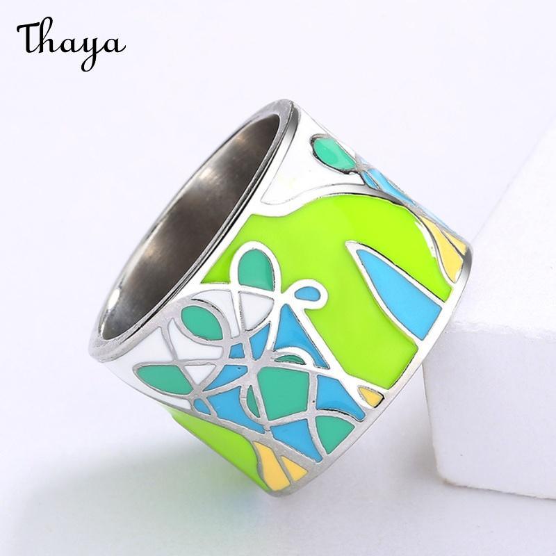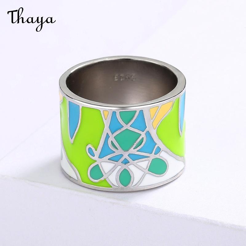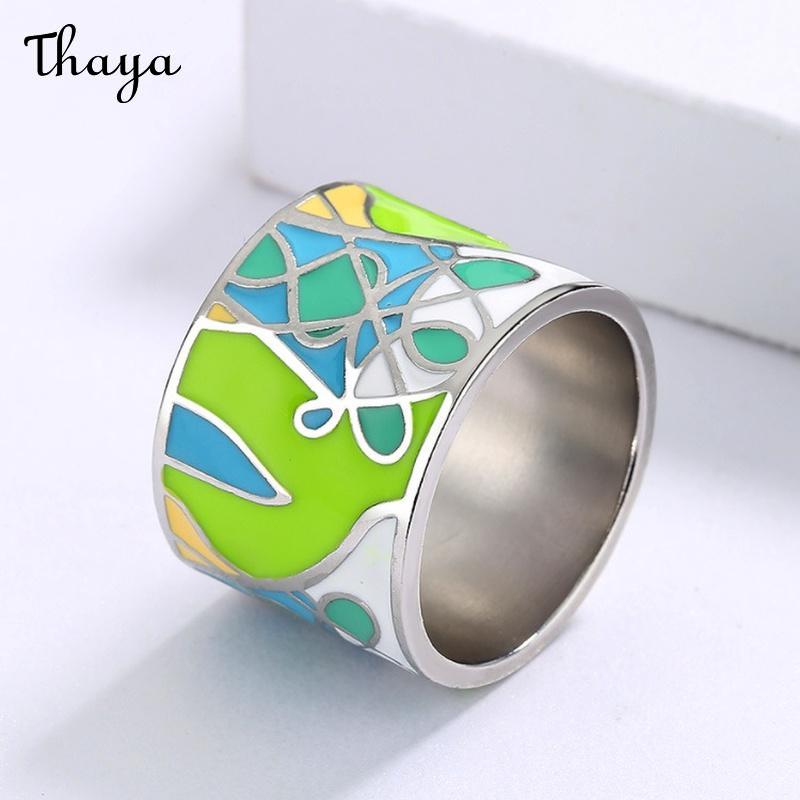 This vibrant ring features a wide band adorned with colorful enamel detailing, creating a unique and eye-catching design. The smooth, rounded edges ensure a comfortable fit.
