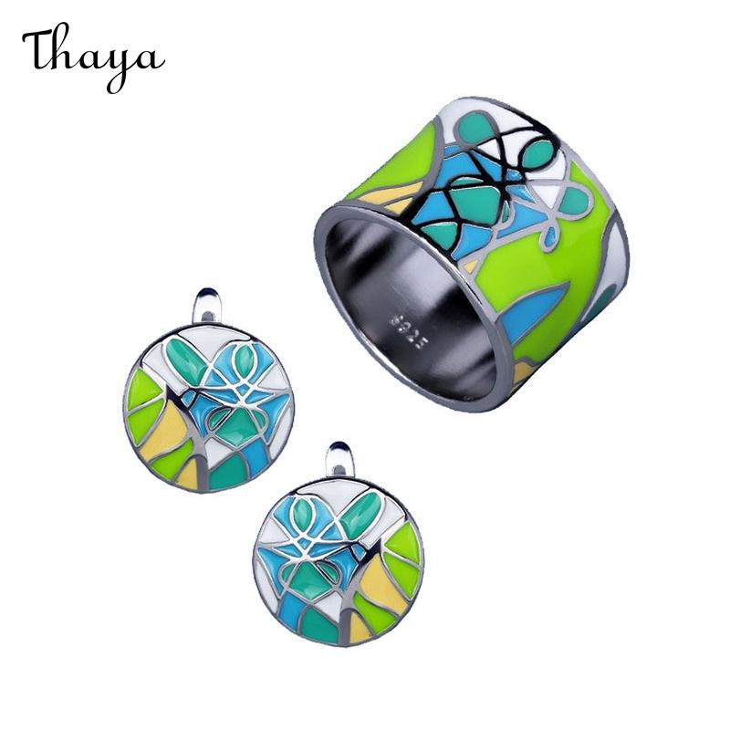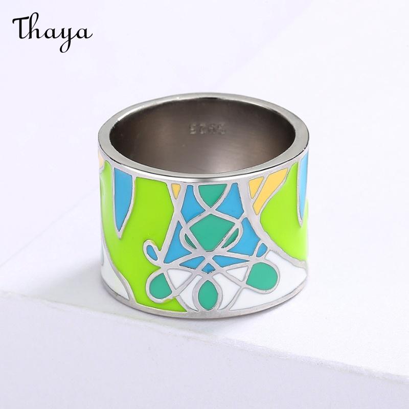 This eye-catching jewelry set includes a wide band ring and matching circular earrings. Each piece features a vibrant enamel design with geometric shapes and colorful inlays, creating a modern and artistic aesthetic.