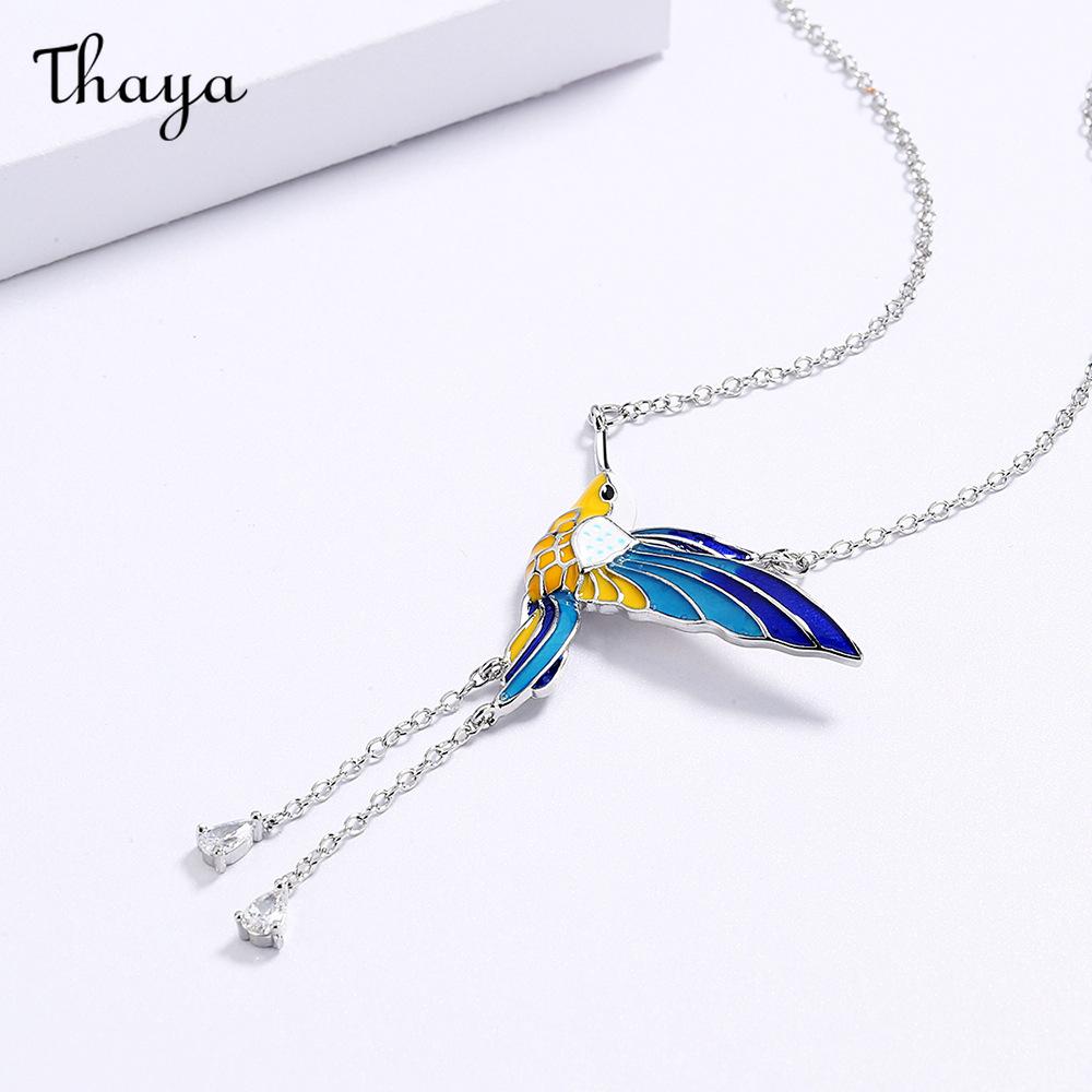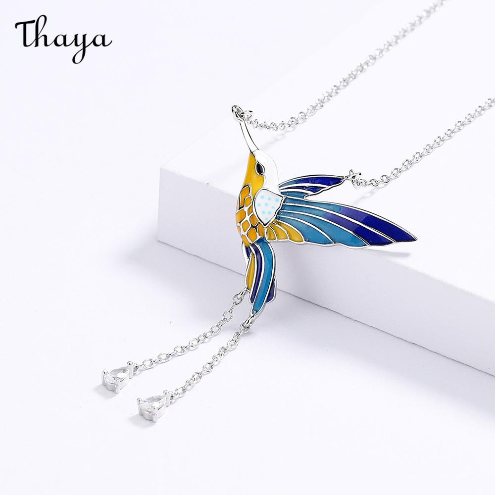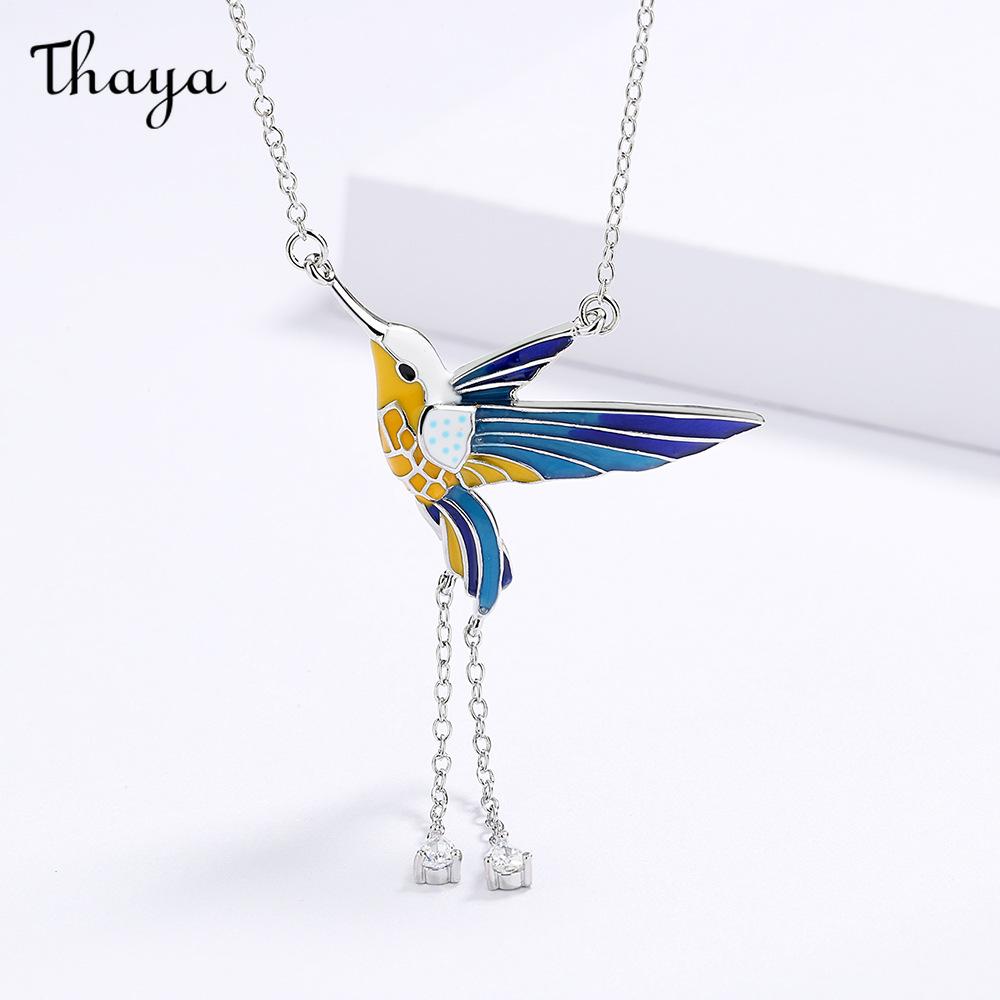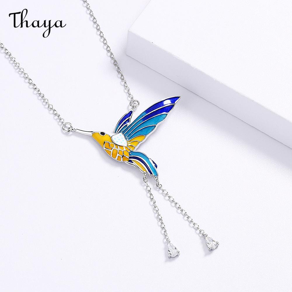 This eye-catching necklace features a delicate hummingbird pendant.The hummingbird's body is adorned with vibrant blue, yellow, and white enamel detailing, creating a stunning visual effect. Two teardrop stones are suspended below the hummingbird, adding a touch of elegance and movement.