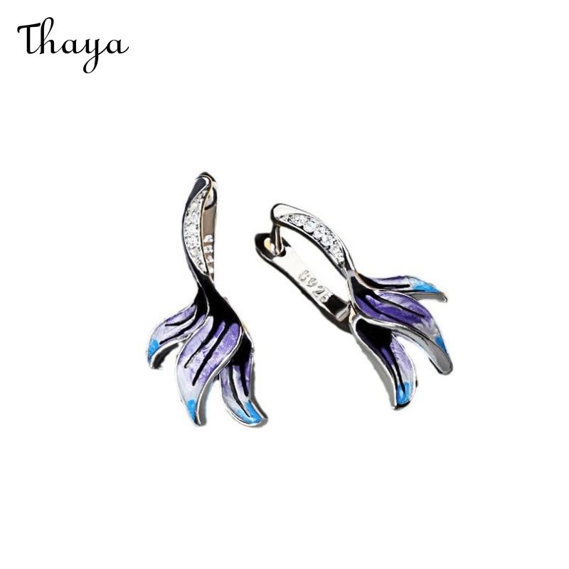 This captivating jewelry set showcases an elegant leaf design, featuring a delicate necklace, a ring, and a pair of matching earrings. The leaves are adorned with a vibrant blend of purple, black, and blue enamel, creating a striking visual contrast.