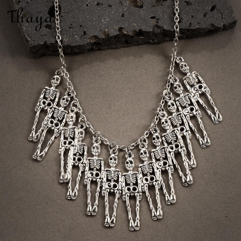 Design: Features intricately detailed skeleton hand designs, adding a touch of macabre elegance to any outfit. The necklace showcases two skeletal hands that appear to embrace the neck, while the earrings mimic the same design, creating a cohesive and bold statement.