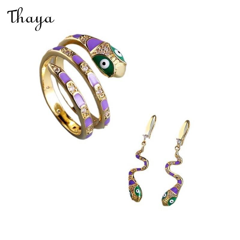 Elevate your style with this unique snake-themed jewelry set, featuring a striking ring and matching earrings. The snake design coils elegantly, adorned with sparkling accents and vibrant enamel detailing.