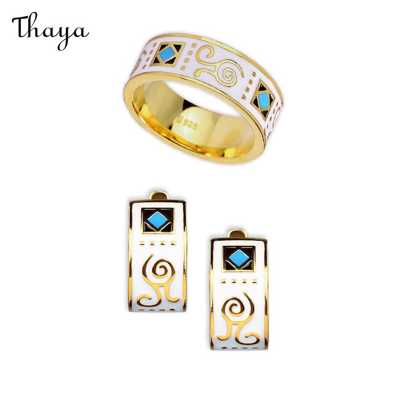 This stylish jewelry set features a ring and a pair of earrings. Each piece is adorned with white enamel and a geometric pattern, inlaid with blue gem stones.