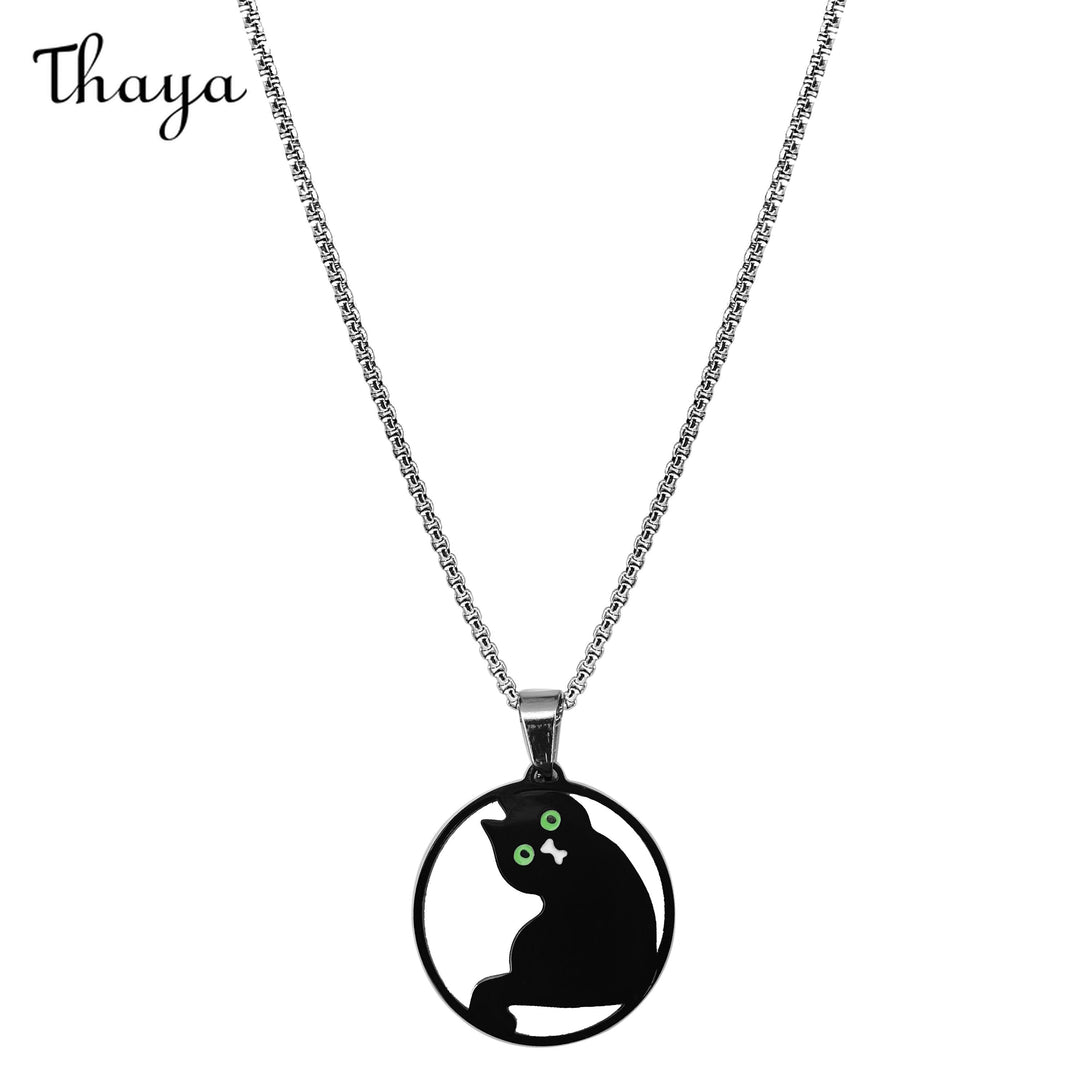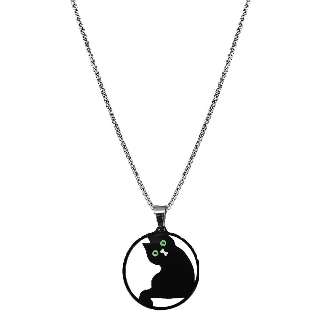 This whimsical necklace features a round pendant showcasing a sleek black cat silhouette with striking green eyes. The design is simple yet captivating, making it a fun and stylish accessory.