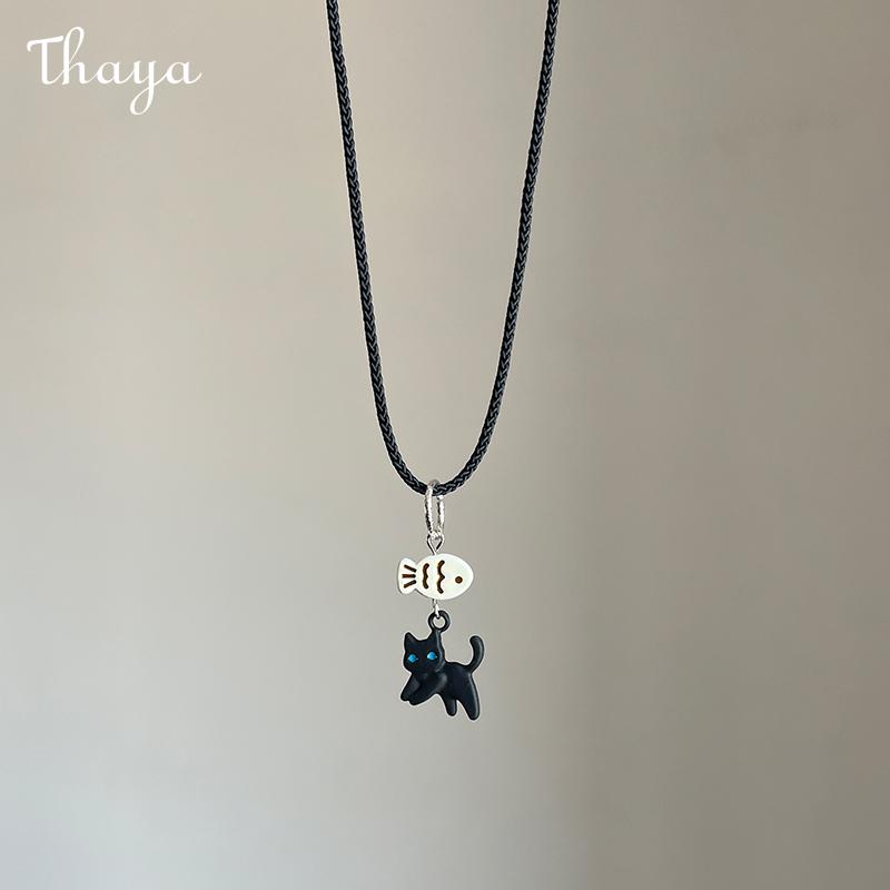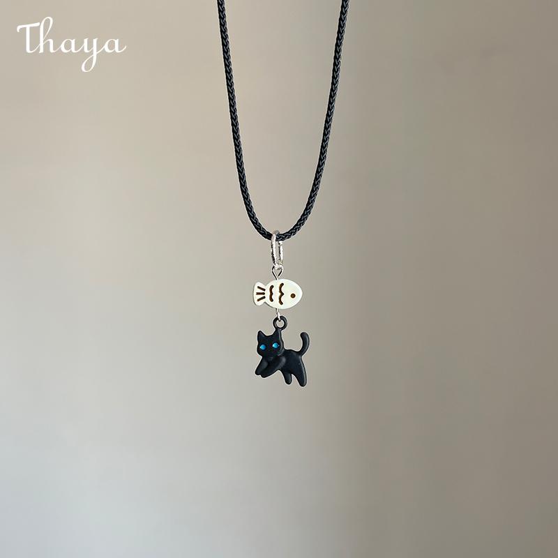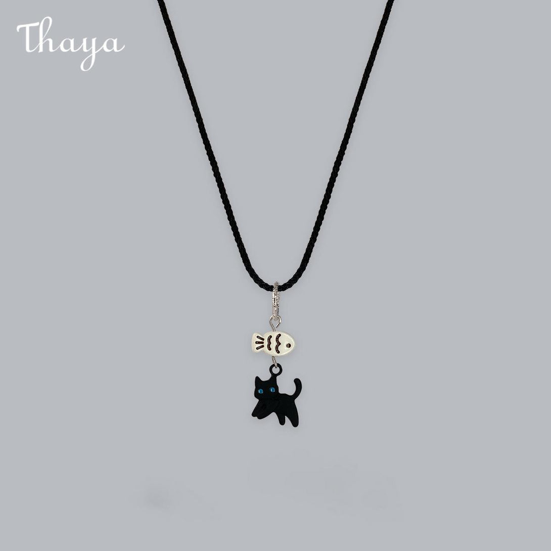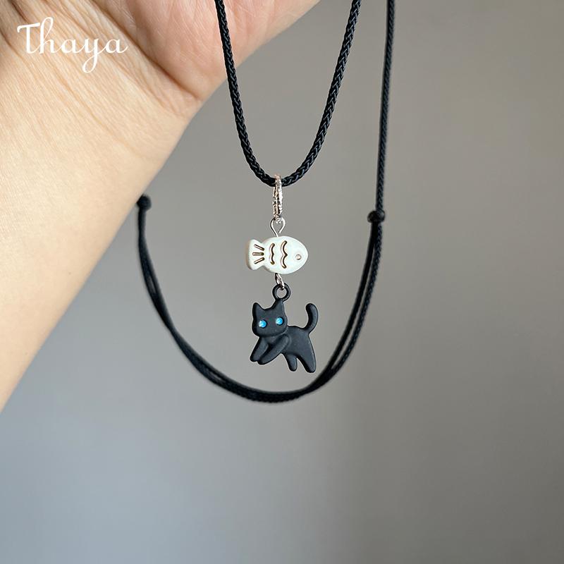 This charming necklace features a playful design with a black cat and a fish pendant. The cat has distinctive blue eyes, adding a touch of whimsy to the accessory.The cord complements the pendants, creating a balanced and stylish piece.