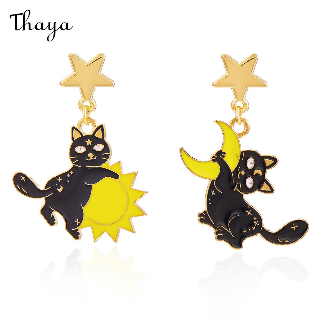 • Design: Asymmetrical design with a star stud connected to a dangling cat and sun or moon charm.