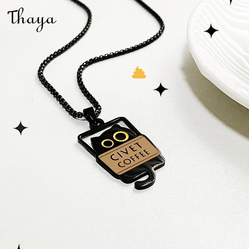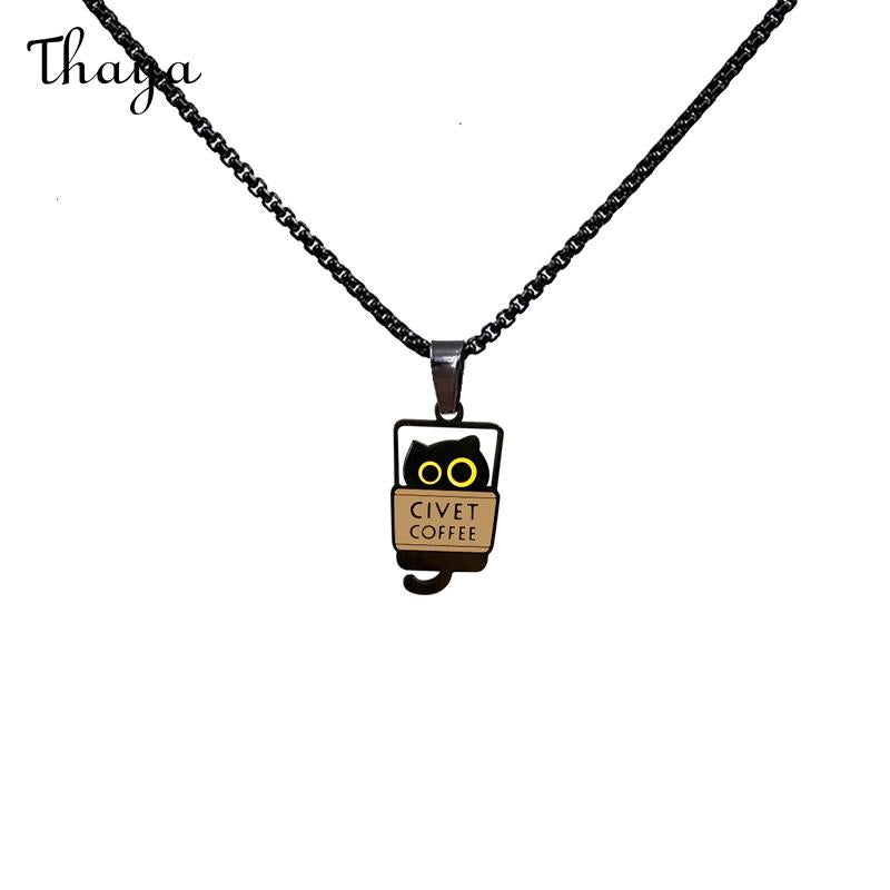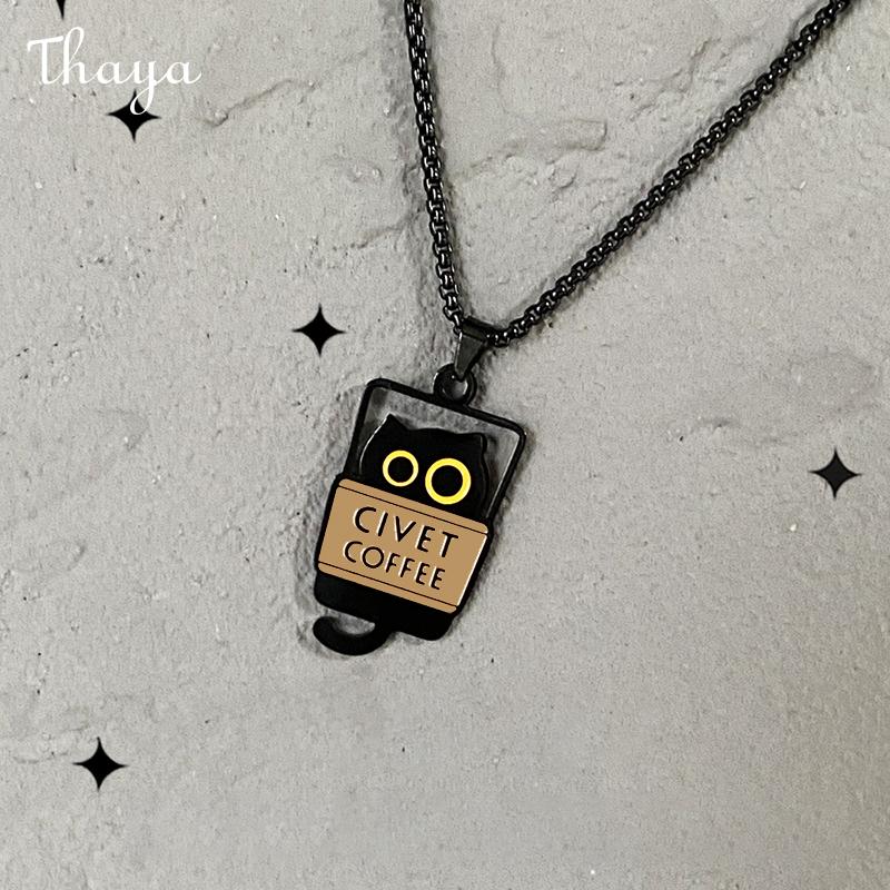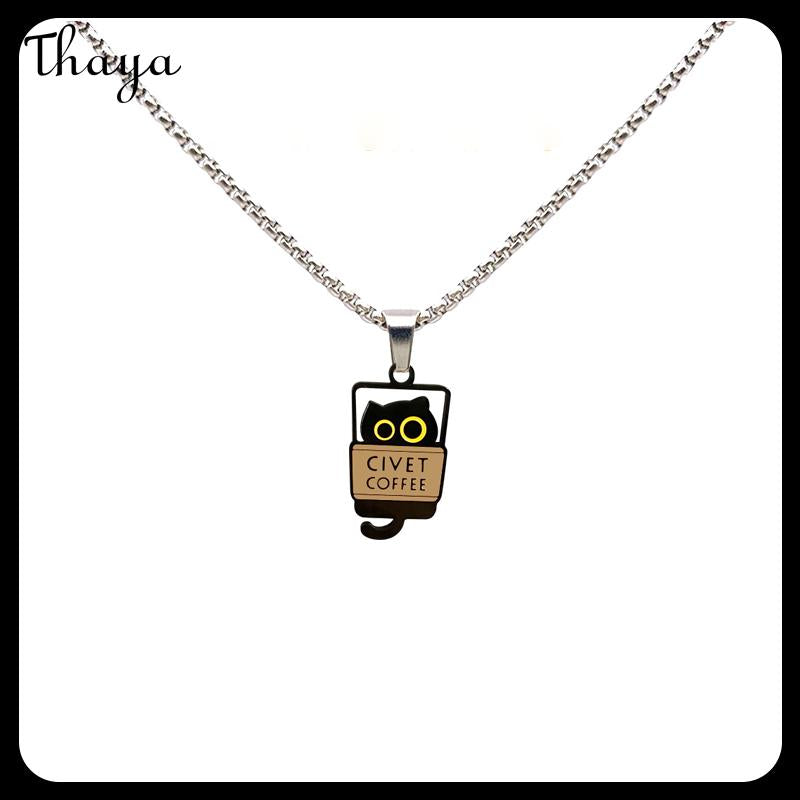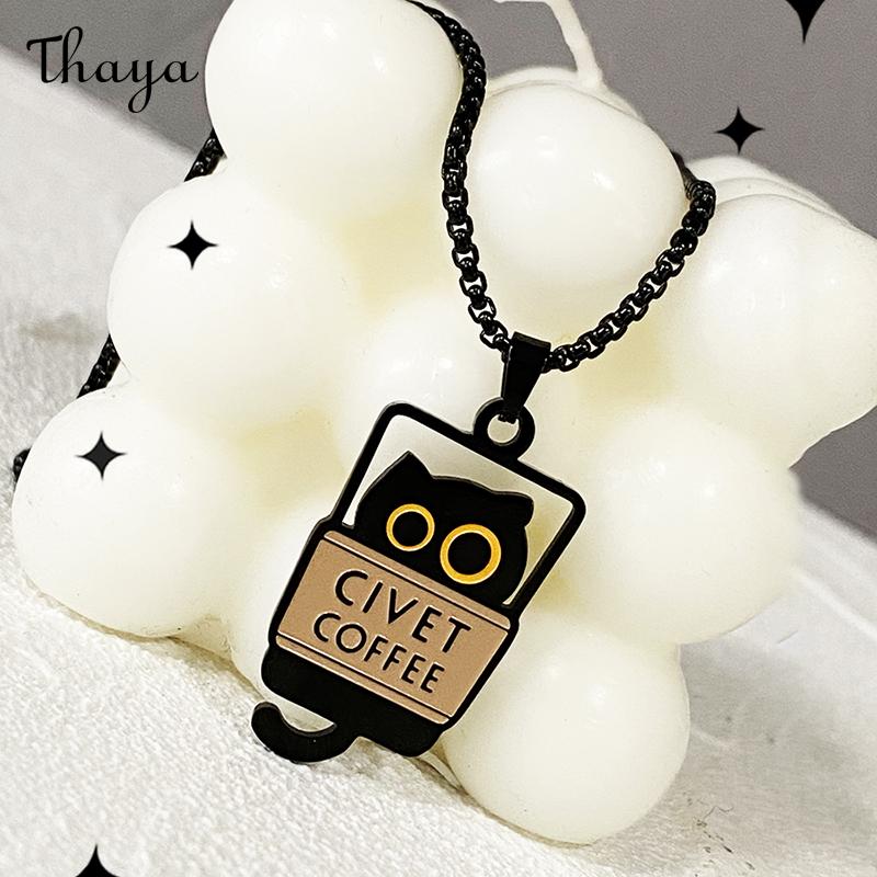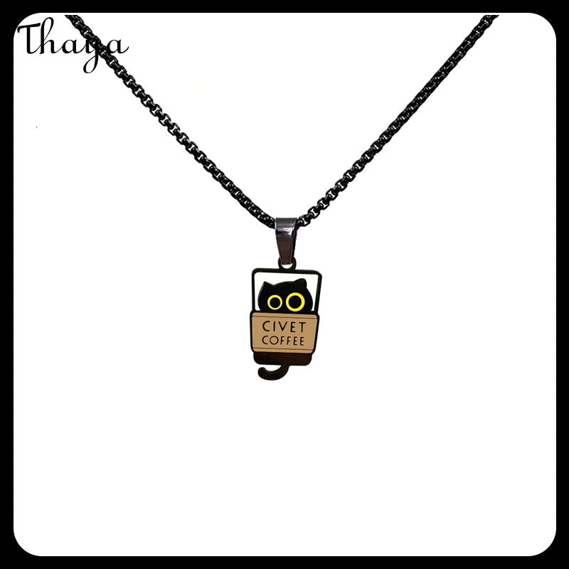This quirky necklace features a playful pendant of a cartoon-style black cat inside a coffee cup. The design is modern and fun.