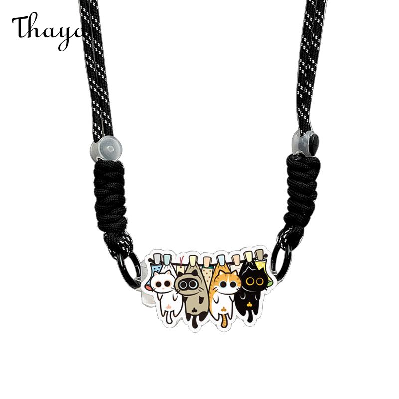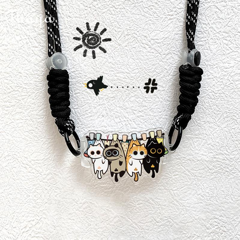 This adorable lanyard features a clear, rectangular pendant with a whimsical illustration of four cats hanging on a clothesline. The illustration is colorful and fun, perfect for cat lovers.