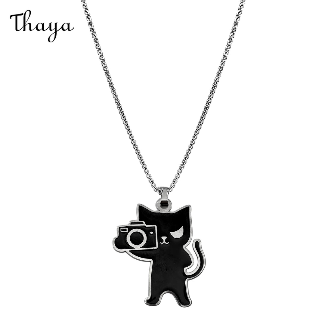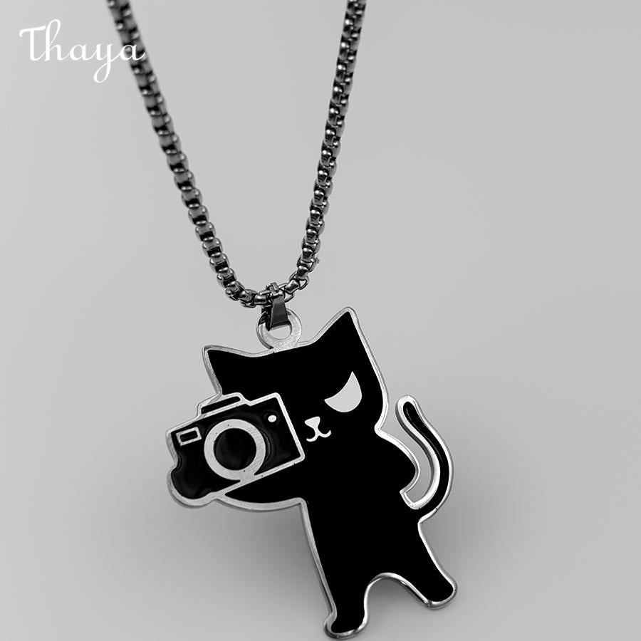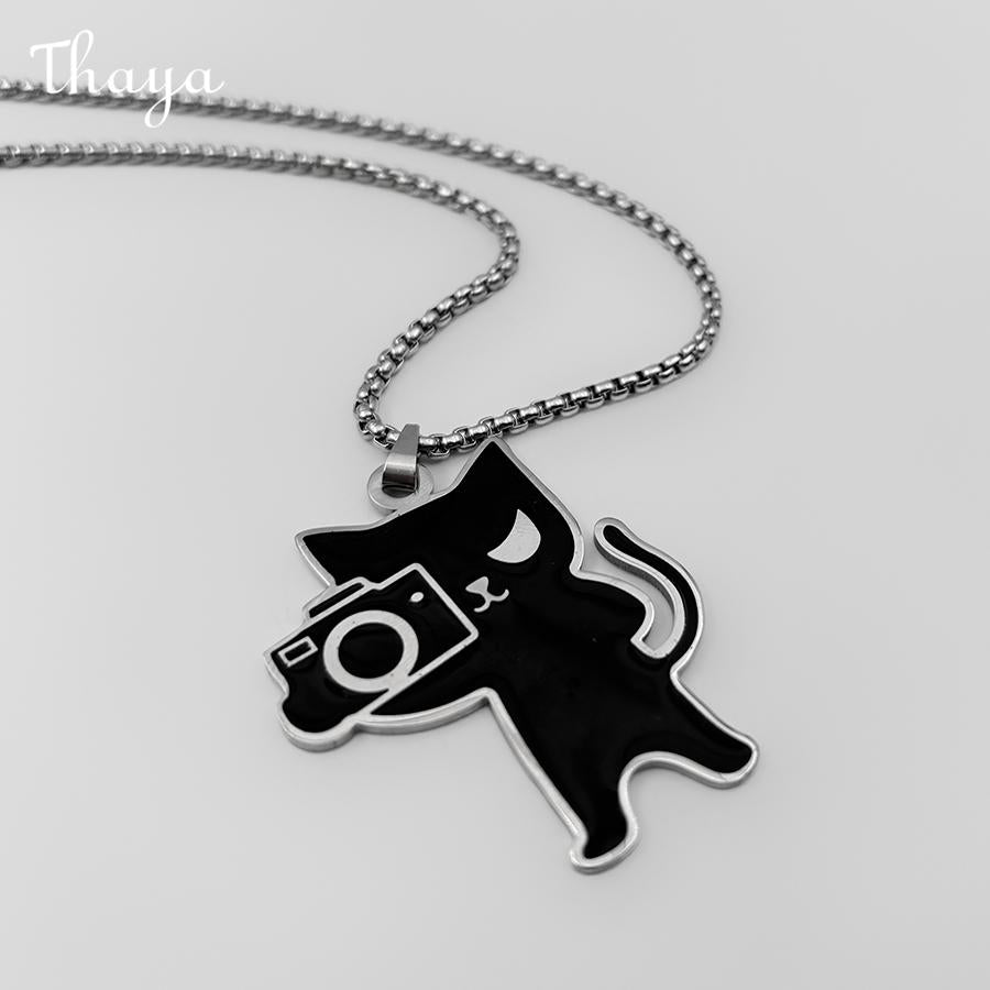 This charming necklace features a unique pendant of a black cat holding a camera. The cat is stylized with a minimalist design and enamel fills, creating a fun and playful look.