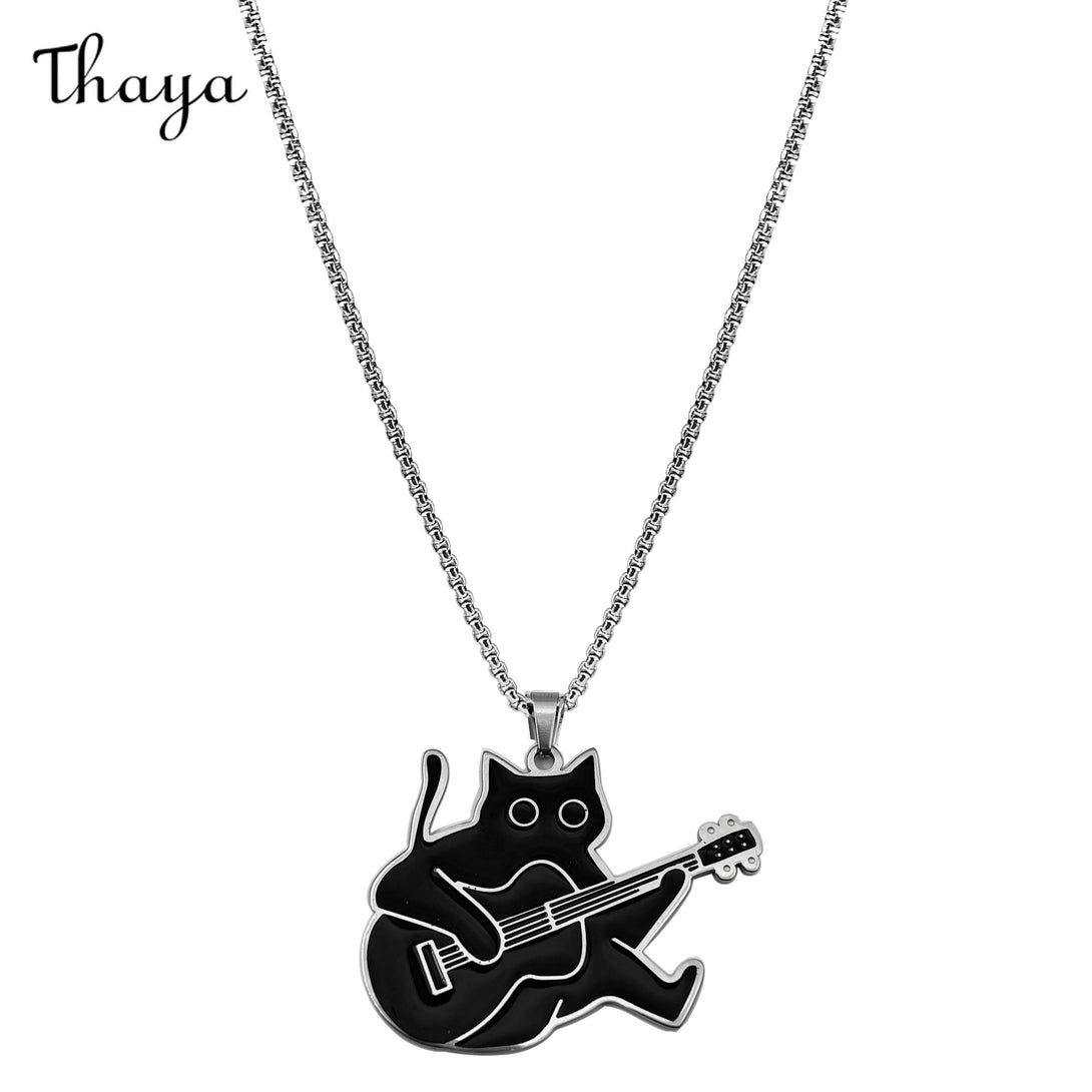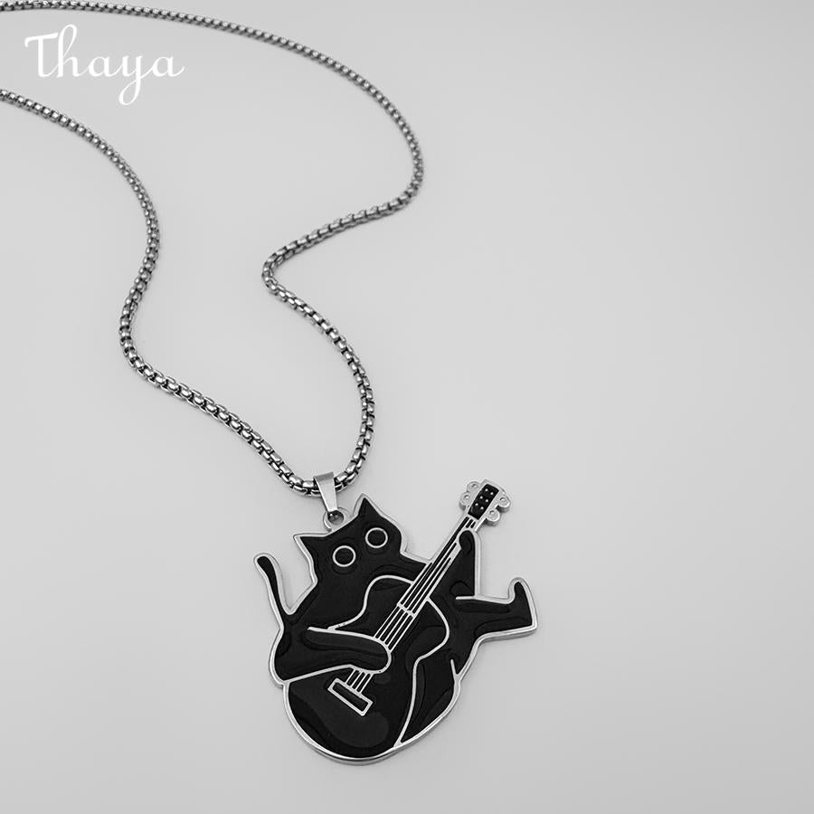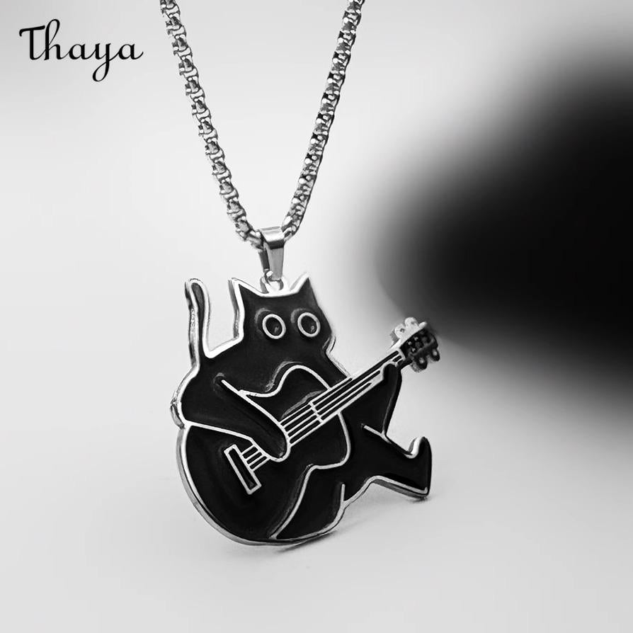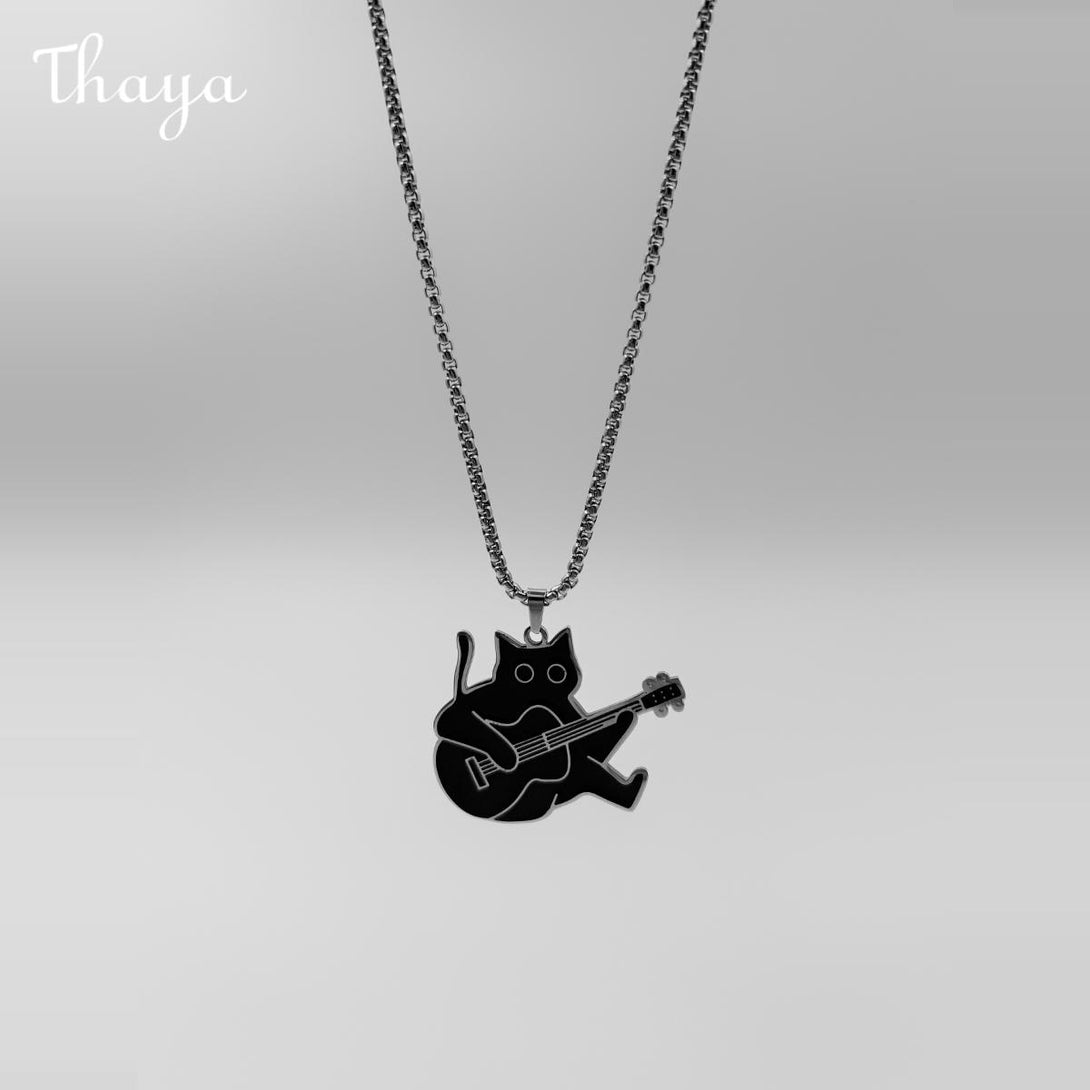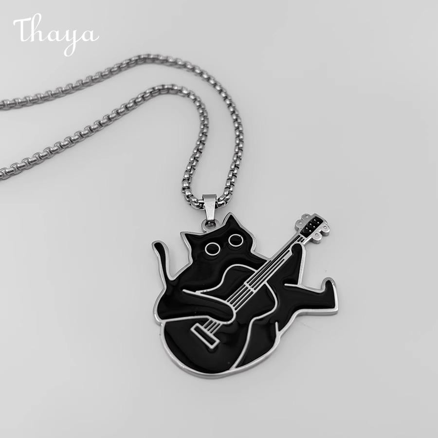 This playful necklace features a charming pendant of a black cat strumming a guitar. The pendant's outline is highlighted with a metallic finish, adding a touch of sophistication to the whimsical design.