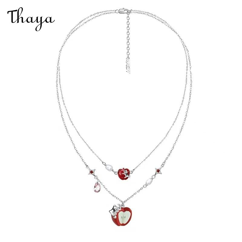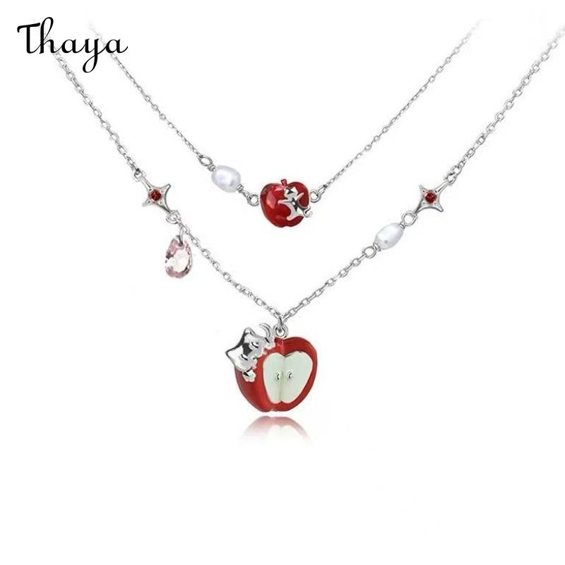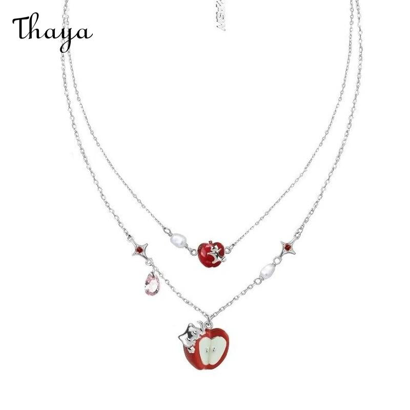 This stylish double-layer necklace features a playful apple design. The bottom layer features a half apple charm with a bite mark, while the top layer showcases a small apple charm. Delicate pearls and diamond-shaped ornaments add a touch of elegance. This necklace brings a fresh, sweet, and charming vibe.