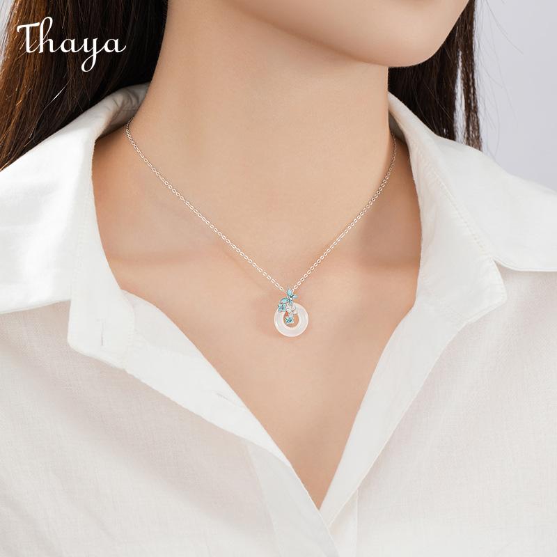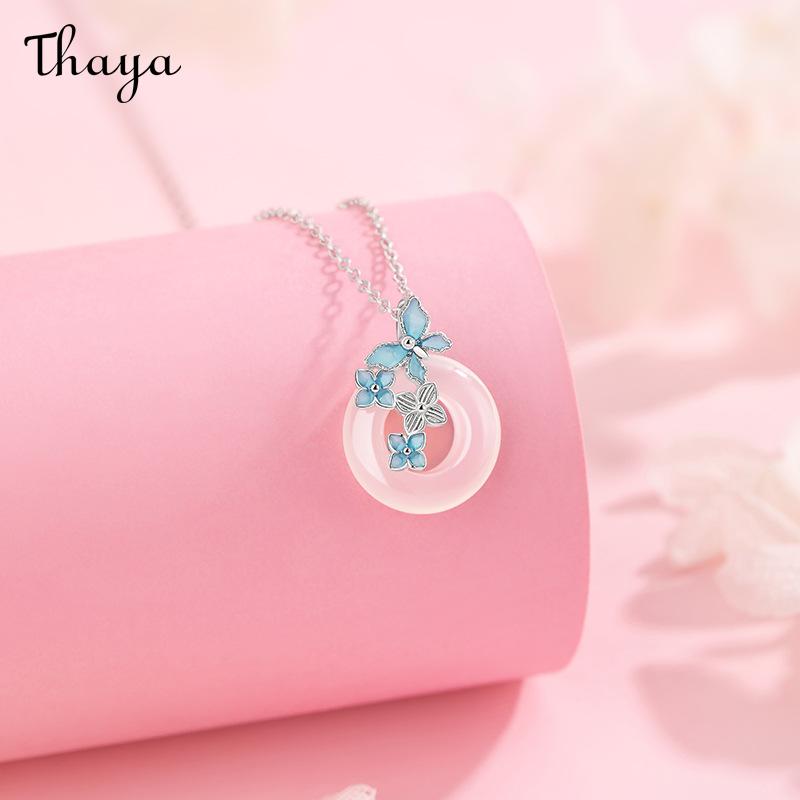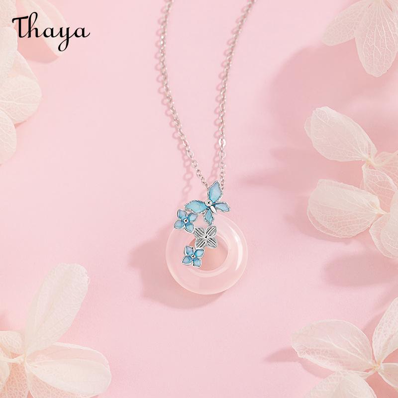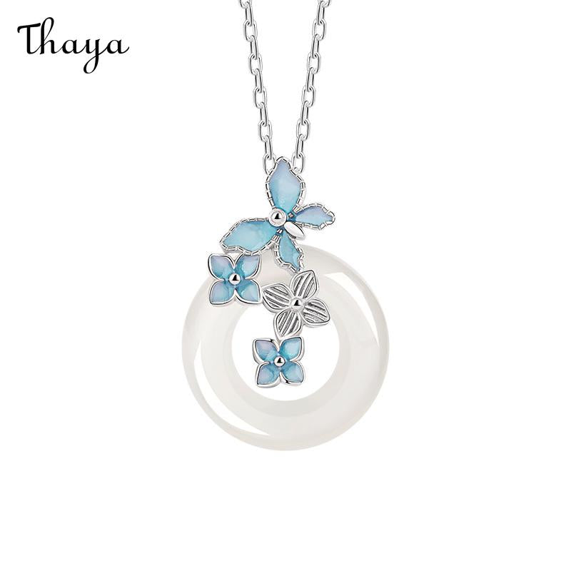 This charming necklace features a jade circle pendant, adorned with a delicate butterfly and flower design. The butterfly and some flowers are luminous, creating a unique glow in the dark effect. This necklace is crafted from S925 silver.