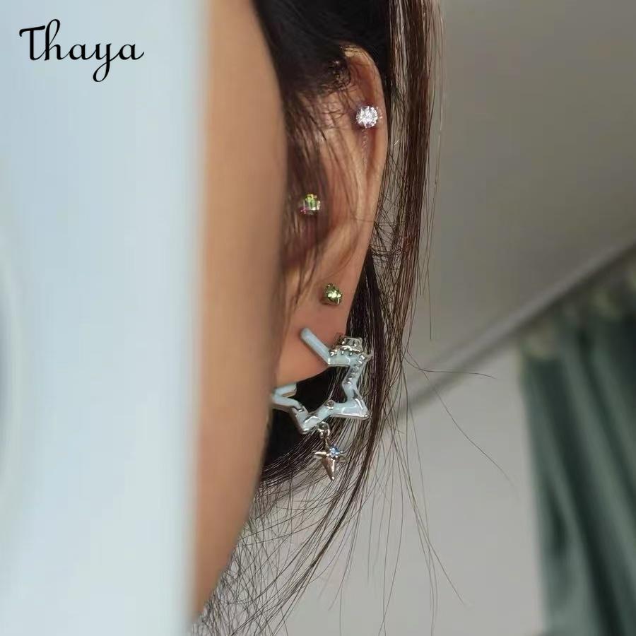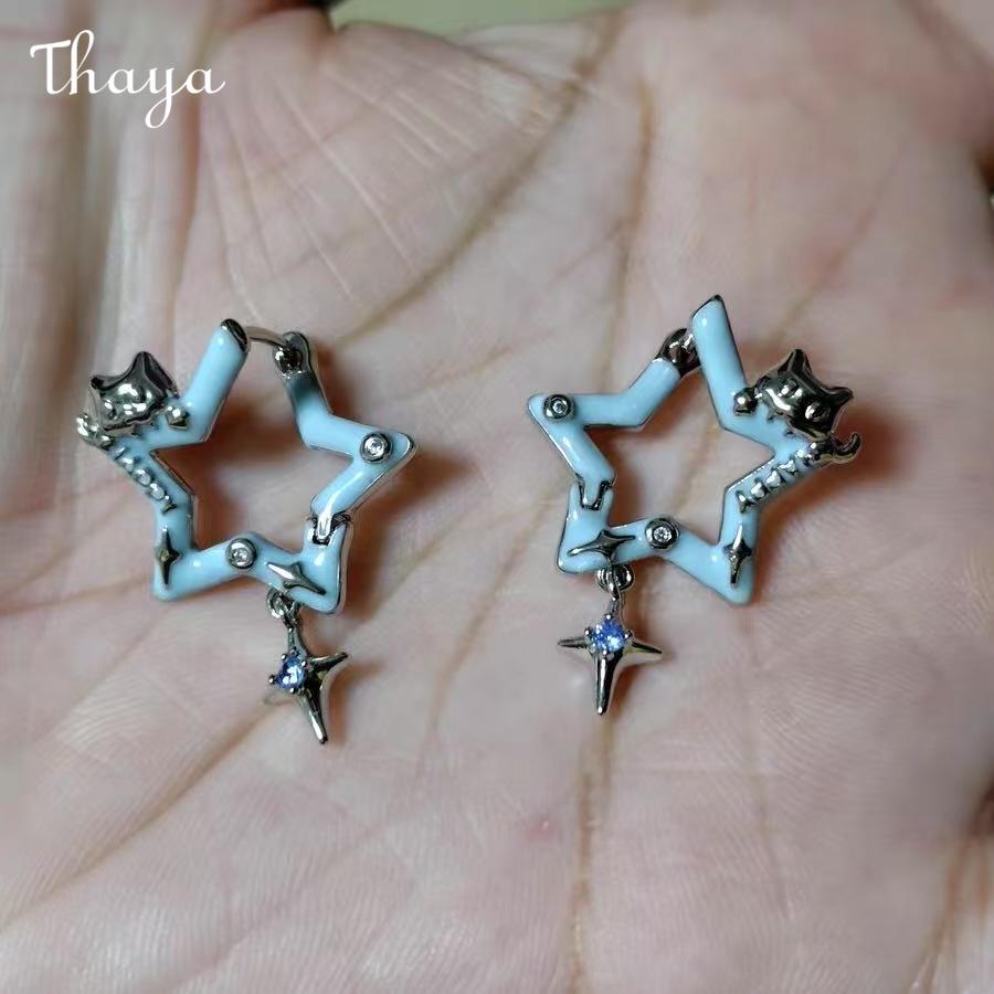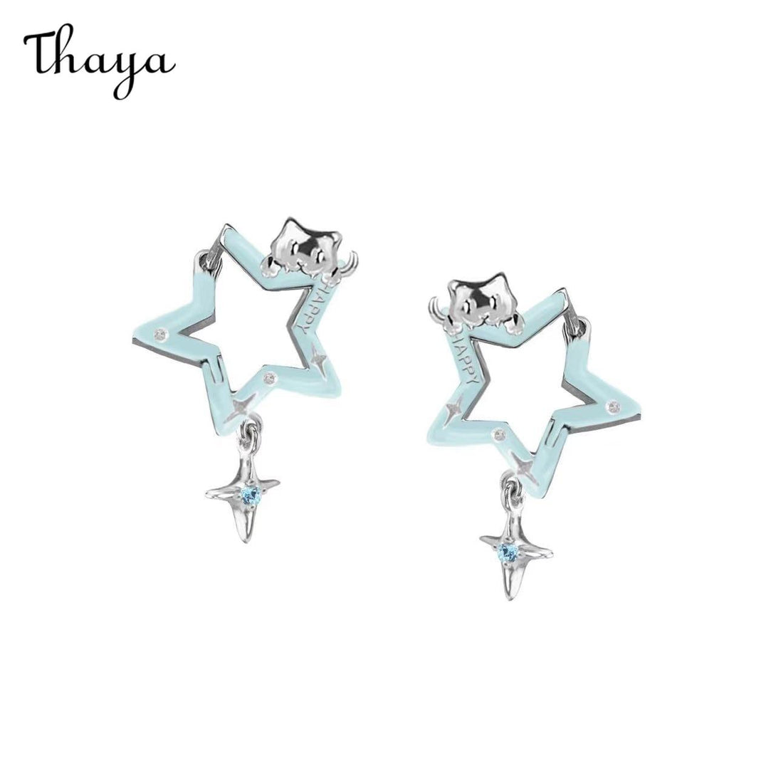 These charming earrings feature a unique star-shaped design. The main element is an open five-pointed star with a vibrant red enamel filling, accented by small sparkling stones. A smaller, four-pointed star dangles below, adding movement and visual interest.