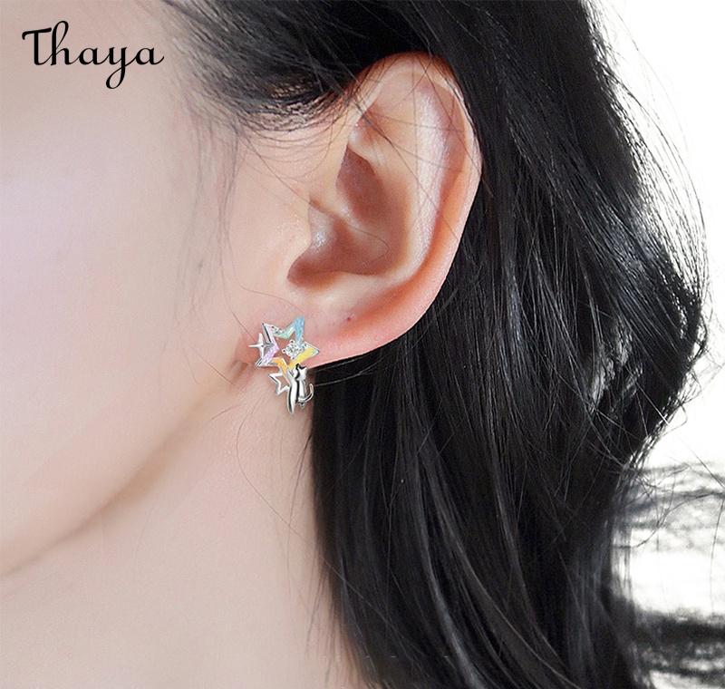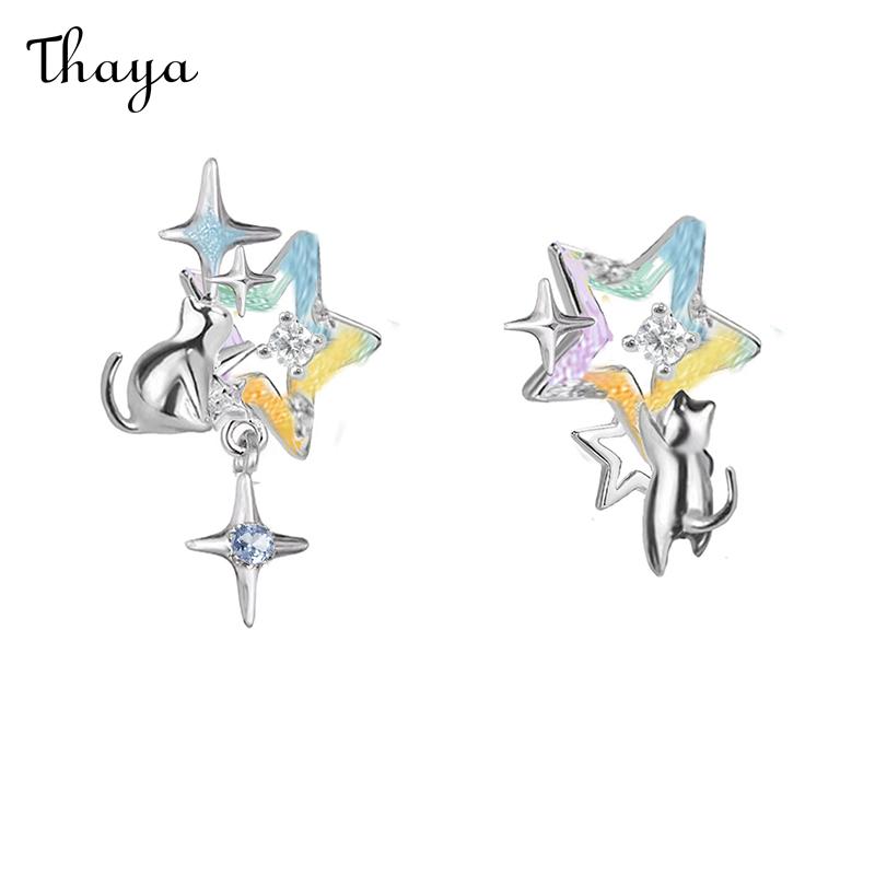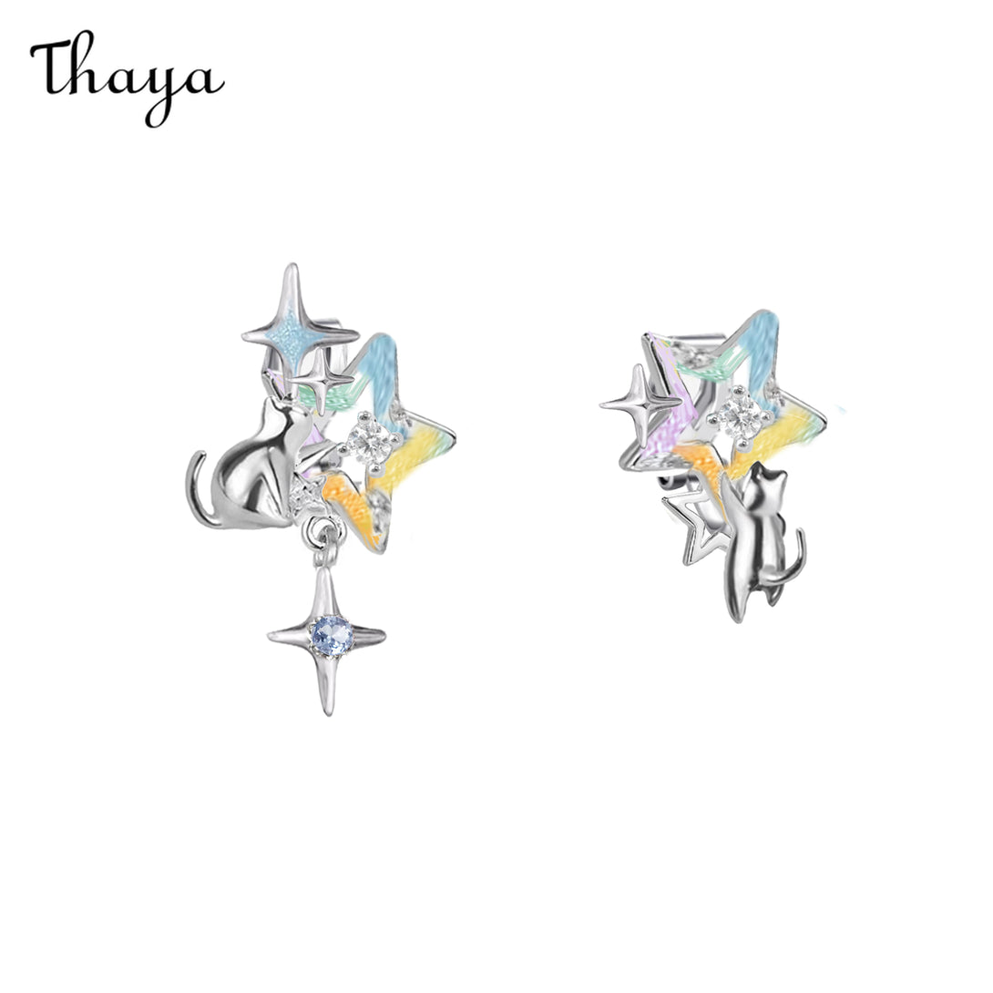 These whimsical earrings feature an adorable cat reaching for a vibrant, star-shaped design. The star is accented with sparkling gemstones, adding a touch of celestial charm.