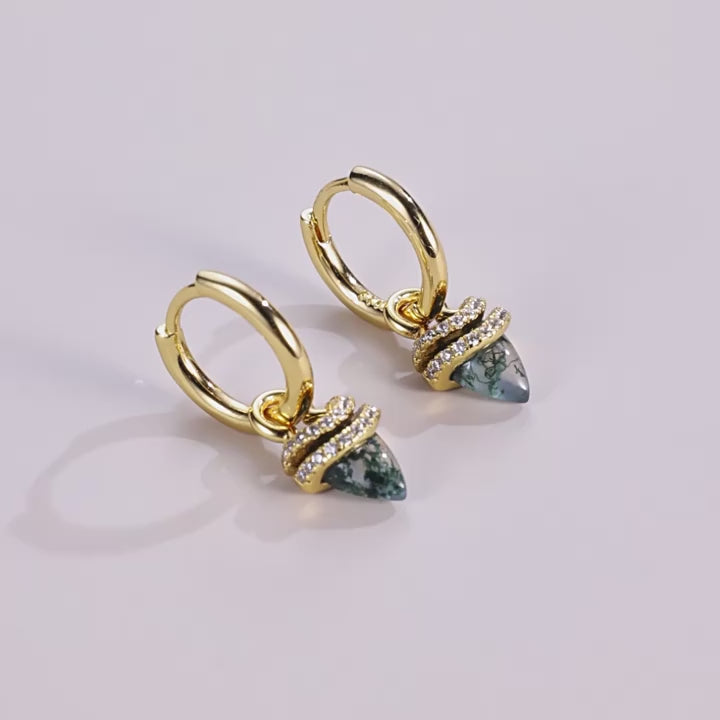 These unique earrings feature textured green moss stone beads, each with its own individual pattern and character. The design is compact, classic, and versatile, perfect for adding a touch of elegance to any outfit.