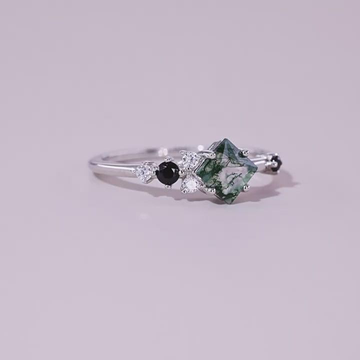 This beautiful ring features a unique green moss stone at its center, framed by smaller black and clear stones for a modern, elegant design.