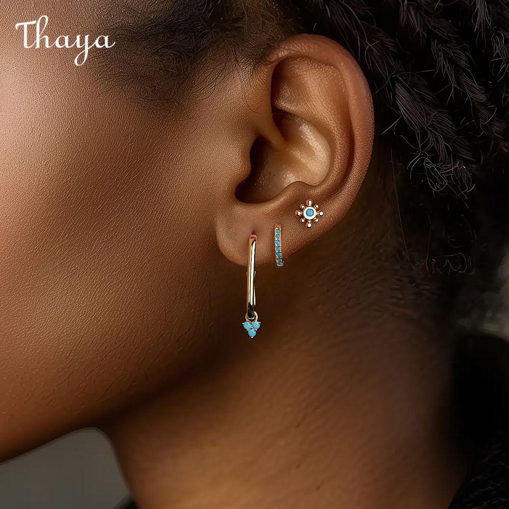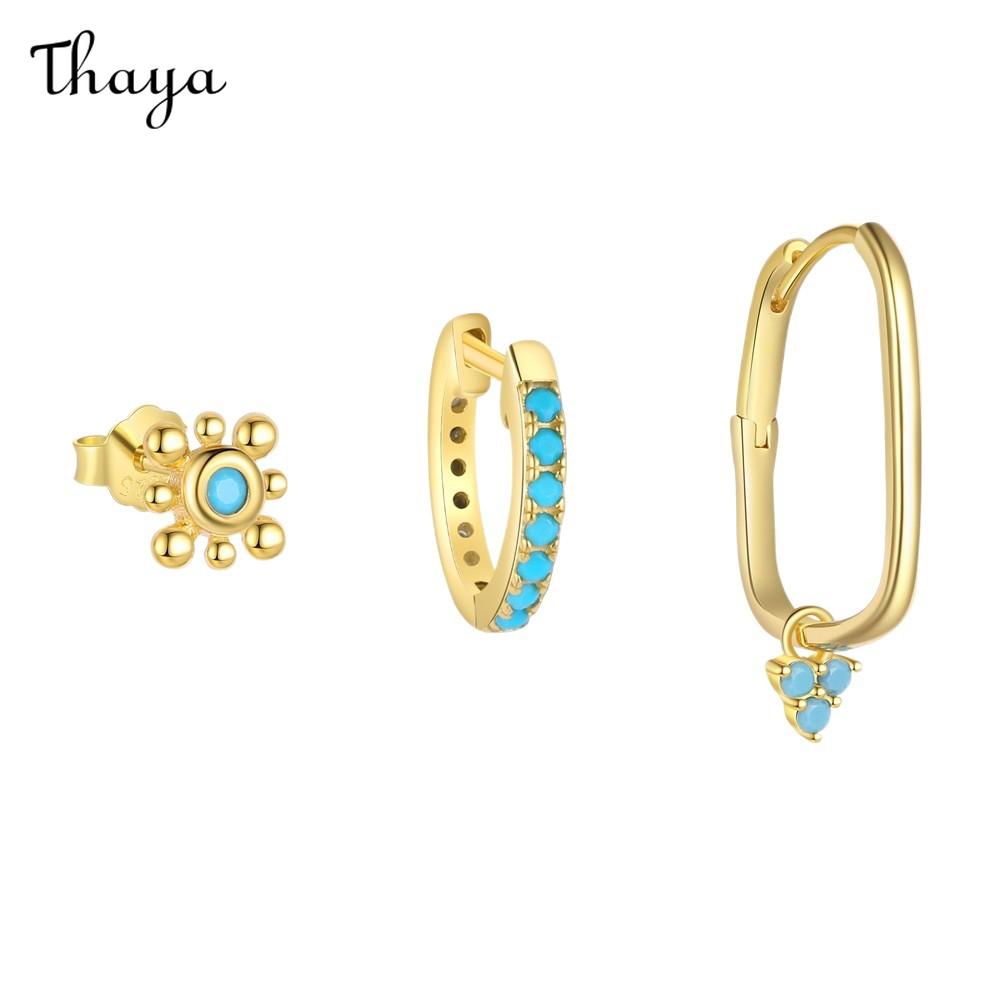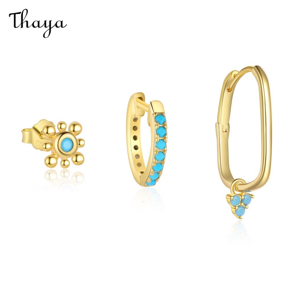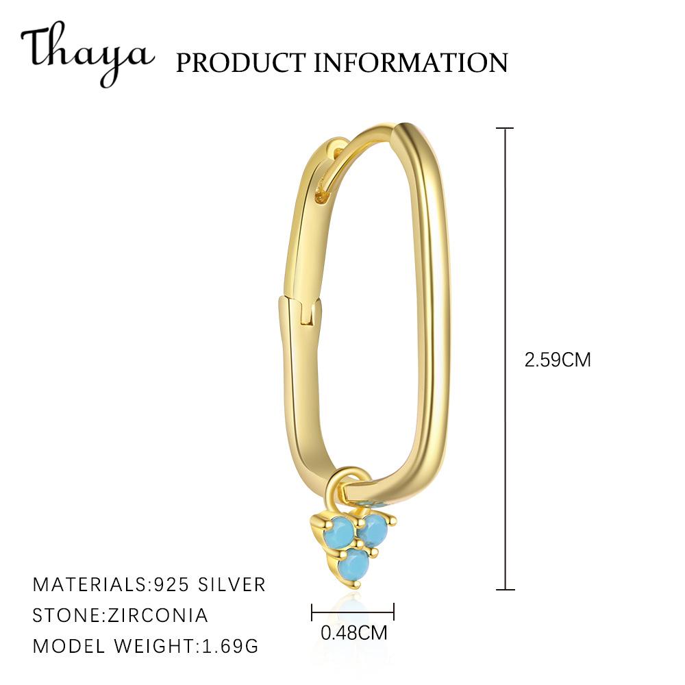 These stylish earrings combine classic hoop design with a modern dangle element. One pair is a small circle, and the other pair is a vertical rectangle, three turquoise stones arranged into a triangular shape adorn the bottom of the dangle, adding a vibrant pop of color.