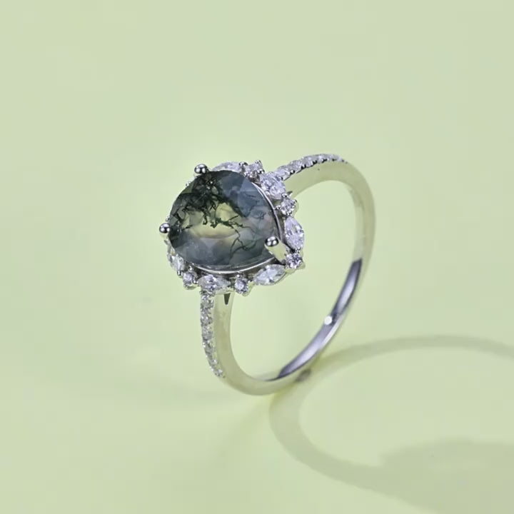 This exquisite ring showcases a captivating moss agate gemstone, set in a delicate and refined design. The central stone features unique, nature-inspired patterns, making each ring a one-of-a-kind piece.