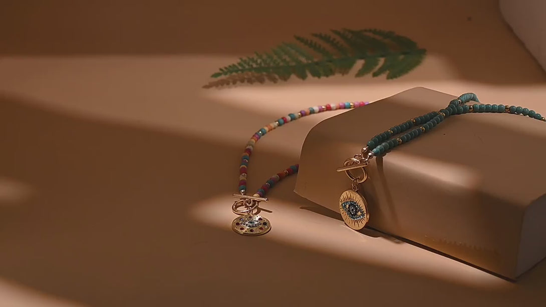 This eye-catching necklace features a beaded chain and a striking evil eye pendant. The round pendant is intricately designed with colored gemstones and a protective eye motif.