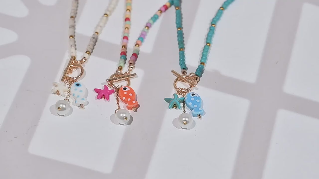 - Shape: Beaded necklace with fish, starfish and pearl charms.