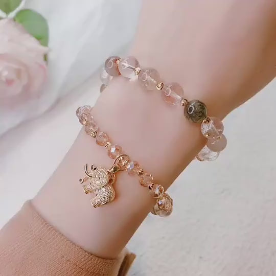 This charming bracelet features a double-strand design with alternating strawberry quartz beads and crystal beads. A delightful elephant charm, encrusted with sparkling details, dangles gracefully from one strand.