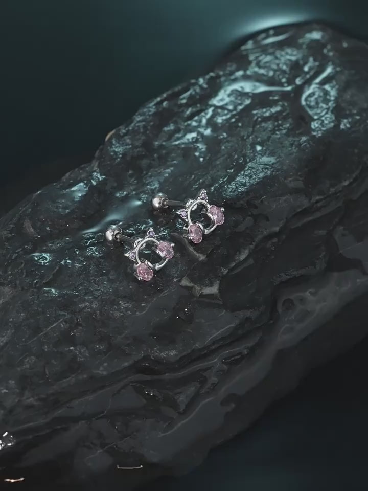 These fun stud earrings feature a unique headphone design, adding a playful touch to any look. The earrings are adorned with pink gemstones inside the headphones and purple gemstone cat ears, creating a cute and eye-catching style.